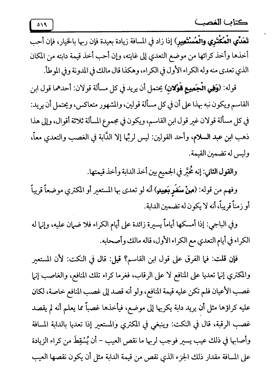 تَعَدِّي الْمُكْتَرِي والْمُسْتَعِيرِ) إذا زاد في المسافة زيادة بعيدة فإن ربها بالخيار، فإن أحب أخذها وأخذ كرائها من موضع التعدي إلى غايته، وإن أحب أخذ قيمة دابته من المكان الذي تعدى منه وله الكراء الأول في الكراء، وهكذا قال مالك في المدونة وفي الموطأ.