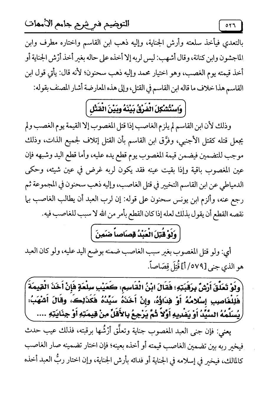 وذلك لأن ابن القاسم لم يلزم الغاصب إذا قتل المغصوب إلا القيمة يوم الغصب ولم يجعل قتله كقتل الأجنبي، وفرَّق ابن القاسم بأن القتل إتلاف لجميع الذات، وذلك موجب للتضمين فيضمن قيمة المغصوب يوم قطع يده عليه، وأما قطع اليد وشبهه فإن عين المغصوب باقية وإذا بقيت عينه فقد يكون لربه غرض في عين شيئه، وحكى الدمياطي عن ابن القاسم التخيير في قتل الغاصب، وإليه ذهب سحنون في المجموعة ثم رجع عنه، وألزم ابن يونس سحنون على قوله: إن لرب العبد أن يطالب الغاصب بما نقصه القطع أن يقول بذلك لعله إذا كان القطع بأمر من الله لا سبب للغاصب فيه.