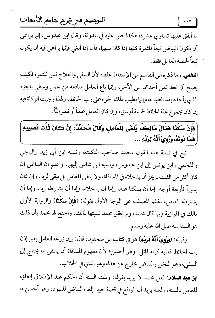 ابن عبد السلام: لعل محمد لا يريد بقوله: وتلك السنة أن الحكم عند الإطلاق إلغاؤه للعامل بالسنة، ولعله يريد أن الواقع في قصة خيبر إلغاء البياض لليهود، وهو أحسن ما