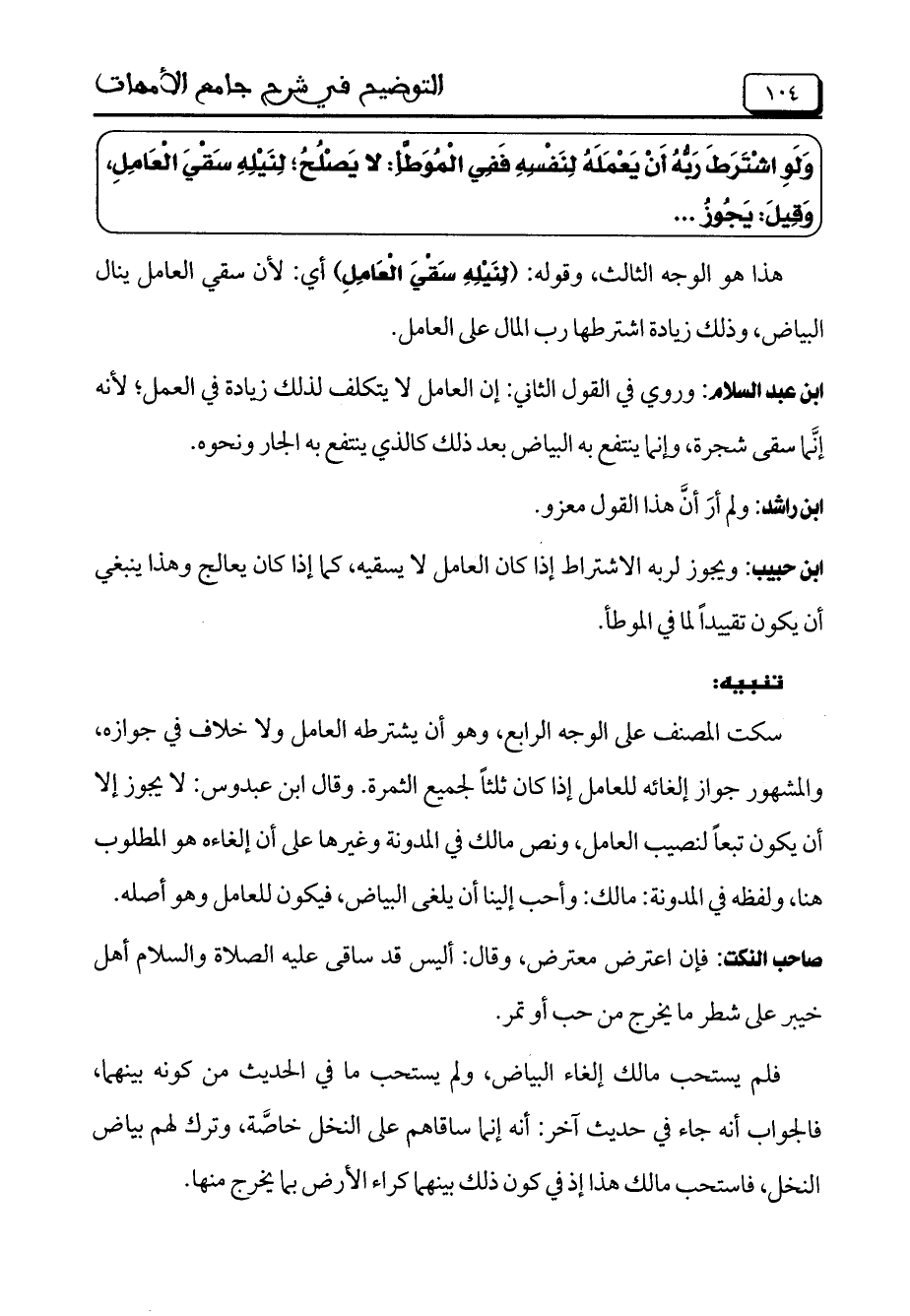ابن عبد السلام: وروي في القول الثاني: إن العامل لا يتكلف لذلك زيادة في العمل؛ لأنه إنما سقى شجرة، وإنما ينتفع به البياض بعد ذلك كالذي ينتفع به الجار ونحوه.