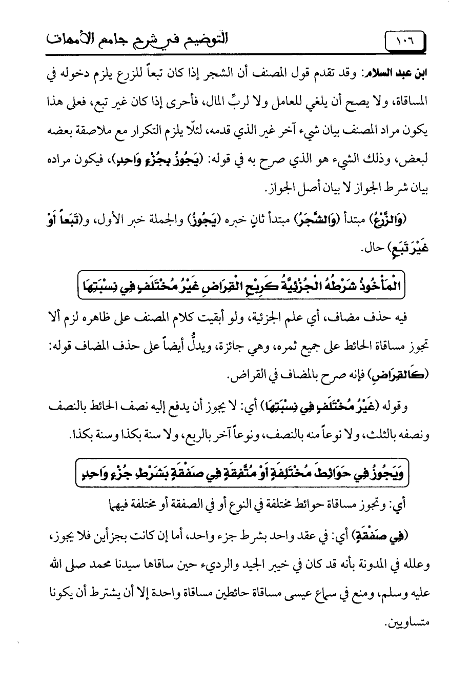 ابن عبد السلام: وقد تقدم قول المصنف أن الشجر إذا كان تبعاً للزرع يلزم دخوله في المساقاة، ولا يصح أن يلغي للعامل ولا لرب المال، فأحرى إذا كان غير تبع، فعلى هذا يكون مراد المصنف بيان شيء ىخر غير الذي قدمه، لئلا يلزم التكرار مع ملاصقة بعضه لبعض، وذلك الشيء هو الذي صرح به في قوله: (يَجُوزُ بِجُزْءٍ وَاحِدٍ) فيكون مراده بيان شرط الجواز لا بيان أصل الجواز.