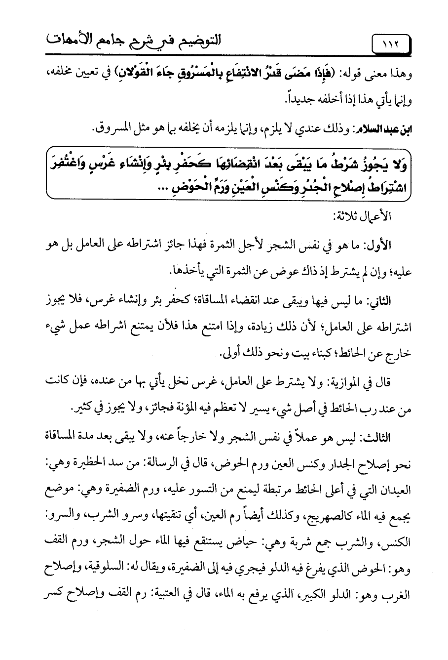 الثالث: ليس هو عملاً في نفس الشجر ولا خارجاً عنه، ولا يبقى بعد مدة المساقاة نحو إصلاح الجدار وكنس العين ورم الحوض، قال في الرسالة: من سد الحظيرة وهي: العيدان التي في أعلى الحائط مرتبطة ليمنع من التسور عليه، ورم الضفيرة وهي: موضع يجمع فيه الماء كالصهريج، وكذلك أيضاً رم العين، أي تنقيتها، وسرو الشرب، والسرو: الكنس، والشرب جمع شربة وهي: حياض يستنقع فيها الماء حول الشجر، ورم القف وهو: الحوض الذي يفرغ فيه الدلو فيجري فيه إلى الضفيرة، ويقال له: السلوقية، وإصلاح الغرب وهو: الدلو الكبير، الذي يرفع به الماء، قال في العتبية: رم القف وإصلاح كسر