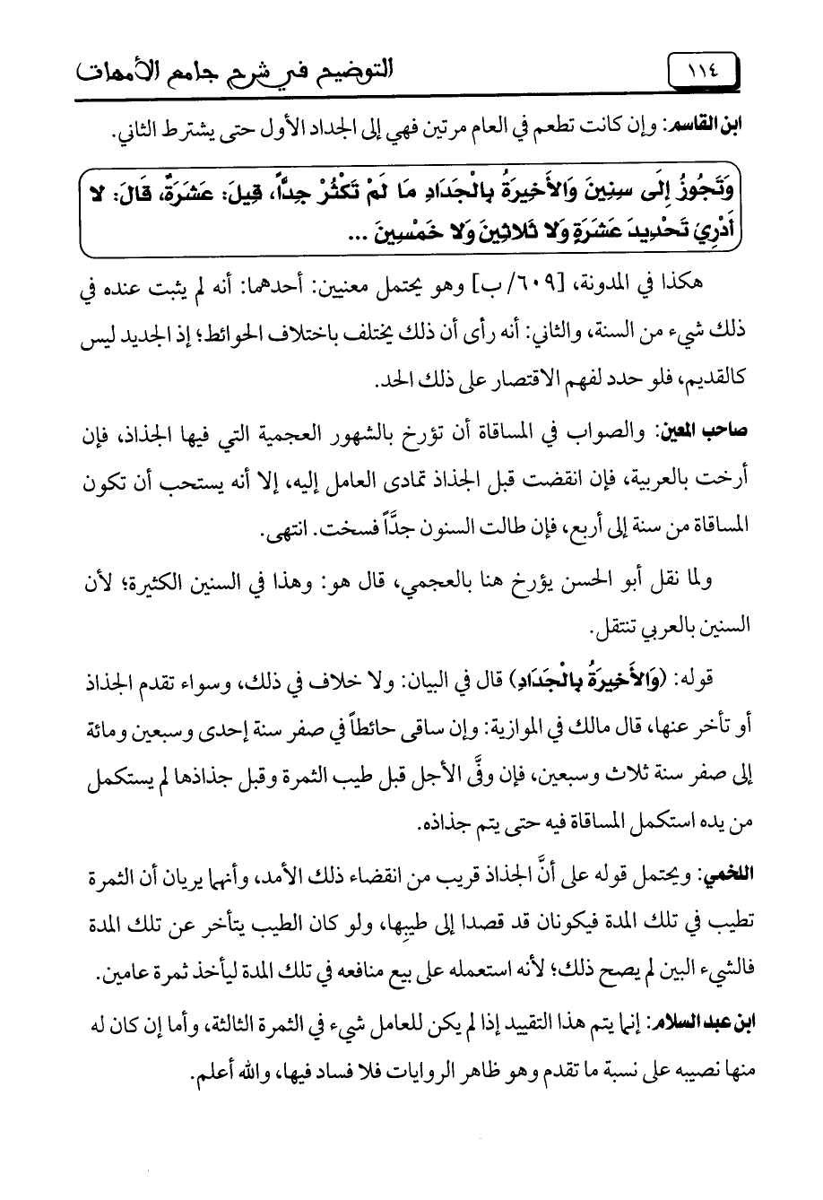 وَتَجُوزُ إِلَى سِنِينَ وَالأَخِيرَةُ بِالْجَدَادِ مَا لَمْ تَكْثُرْ جِدَّاً، قِيلَ: عَشَرَةُ، قَالَ: لا أَدْرِي تَحْدِيدَ عَشَرَةٍ وَلا ثَلاثِينَ وَلا خَمْسِينَ ..