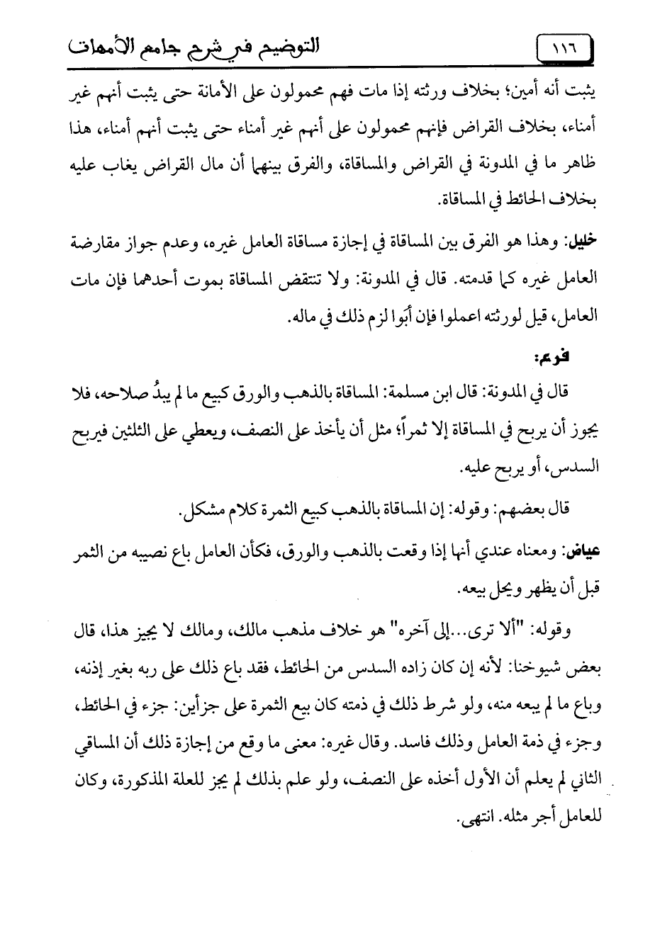 يثبت أنه أمين؛ بخلاف ورثته إذا مات فهم محمولون على الأمانة حتى يثبت أنهم غير أمناء، بخلاف القراض فإنهم محمولون على أنهم غير أمناء حتى يثبت أنهم أمناء، هذا ظاهر ما في المدونة في القراض والمساقاة، والفرق بينهما أن مال القراض يغاب عليه بخلاف الحائط في المساقاة.