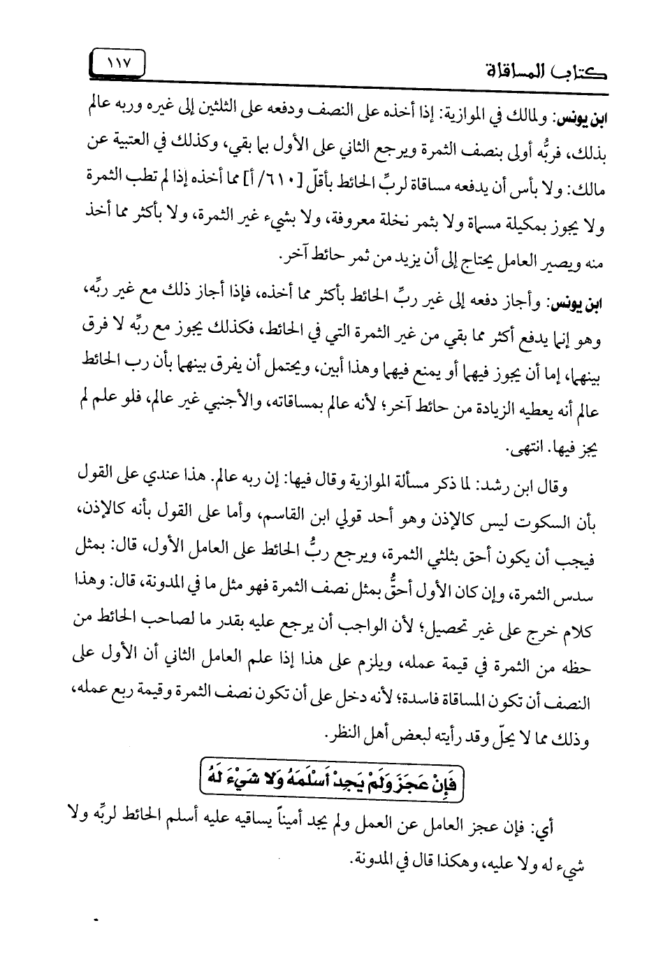ابن يونس: ولمالك في الموازية: إذا أخذه على النصف ودفعه على الثلثين إلى غيره وربه عالم بذلك، فربه أولى بنصف الثمرة ويرجع الثاني على الأول بما بقي، وكذلك في العتبية عن مالك: ولا بأس أن يدفعه مساقاة لرب الحائط بأقل [610/ أ] مما اخذه إذا لم تطب الثمرة ولا يجوز بمكيلة مسماة ولا بثمر نخلة معروفة، ولا بشيء غير الثمرة، ولا بأكثر مما أخذ منه ويصير العامل يحتاج إلى أن يزيد من ثمر حائط آخر.