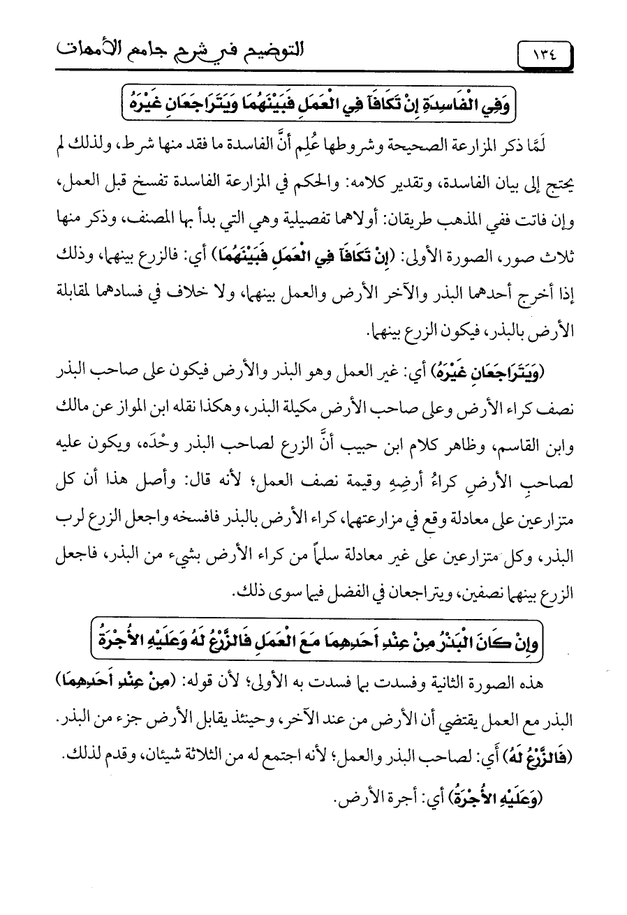(وَيَتَرَاجَعَانِ غَيْرَهُ) أي: غير العمل وهو البذر والأرض فيكون على صاحب البذر نصف كراء الأرض وعلى صاحب الأرض مكيلة البذر، وهكذا نقله ابن المواز عن مالك وابن القاسم، وظاهر كلام ابن حبيب أن الزرع لصاحب البذر وحده، ويكون عليه لصاحب الأرض كراء أرضه وقيمة نصف العمل؛ لأنه قال: وأصل هذا أن كل متزارعين على معادلة وقع في مزارعتهما، كراء الأرض بالبذر فافسخه واجعل الزرع لرب البذر، وكل متزارعين على غير معادلة سلماً من كراء الأرض بشيء من البذر، فاجعل الزرع بينهما نصفين، ويتراجعان في الفضل فيما سوى ذلك.