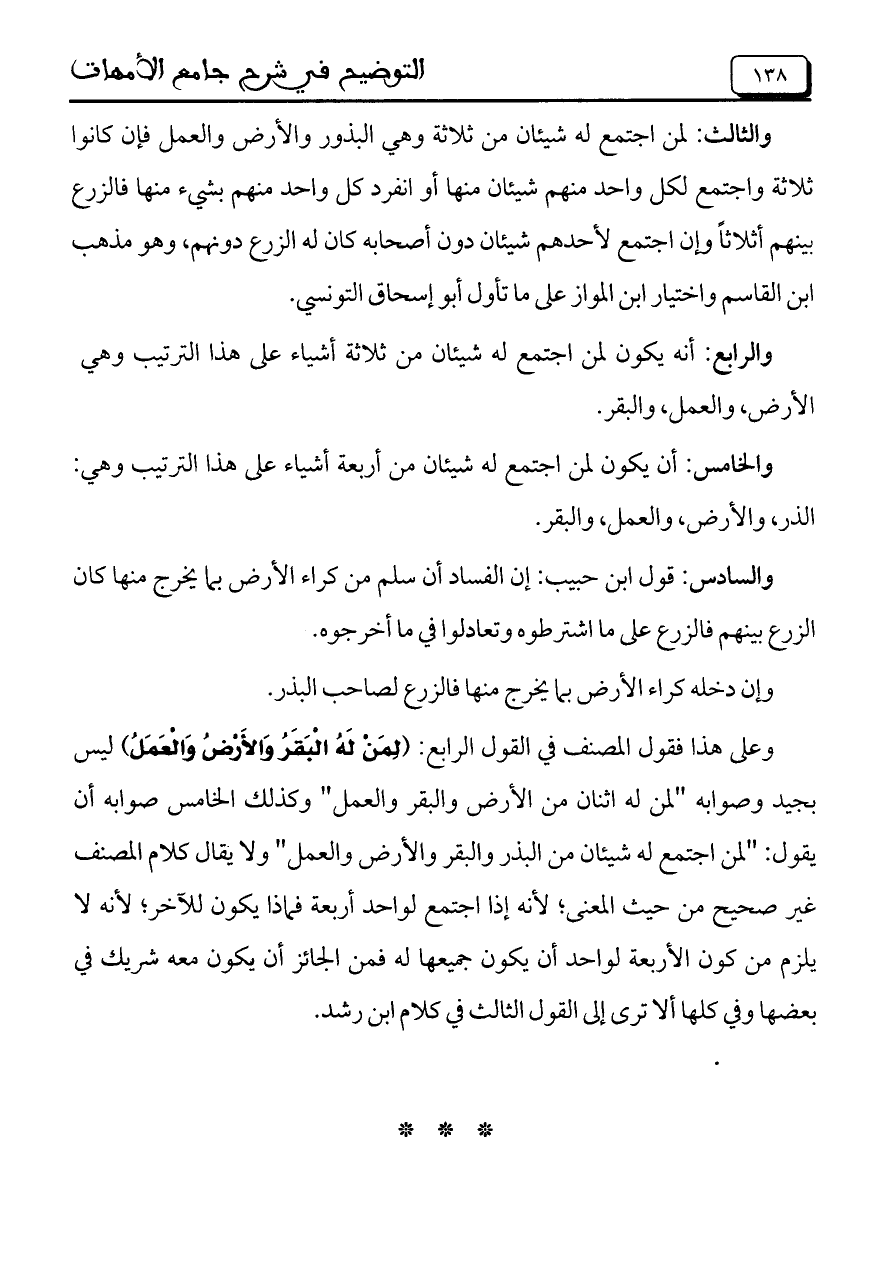 وعلى هذا فقول المصنف في القول الرابع: (لِمَنْ لَهُ الْبَقَرُ والأَرْضِ والْعَمَلِ) ليس بجيد وصوابه "لمن له اثنان من الأرض والبقر والعمل" وكذلك الخامس صوابه أن يقول: "لمن اجتمع له شيئان من البذر والبقر والأرض والعمل" ولا يقال كلام المصنف غير صحيح من حيث المعنى؛ لأنه إذا اجتمع لواحد أربعة فماذا يكون للآخر؛ لأنه لا يلزم من كون الأربعة لواحد أن يكون جميعها له فمن الجائز أن يكون معه شريك في بعضها وفي كلها ألا ترى إلى القول الثالث في كلام ابن رشد.