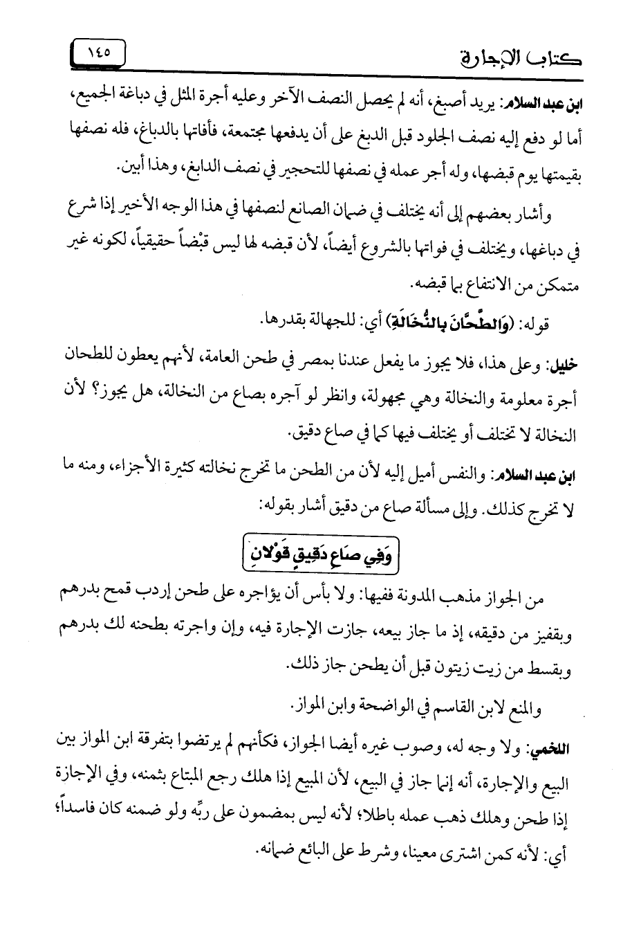 خليل: وعلى هذا، فلا يجوز ما يفعل عندنا بمصر في طحن العامة، لأنهم يعطون للطحان أجرة معلومة والنخالة وهي مجهولة، وانظر لو آجره بصاع من النخالة، هل يجوز؟ لأن النخالة لا تختلف أو يختلف فيها كما في صاع دقيق.