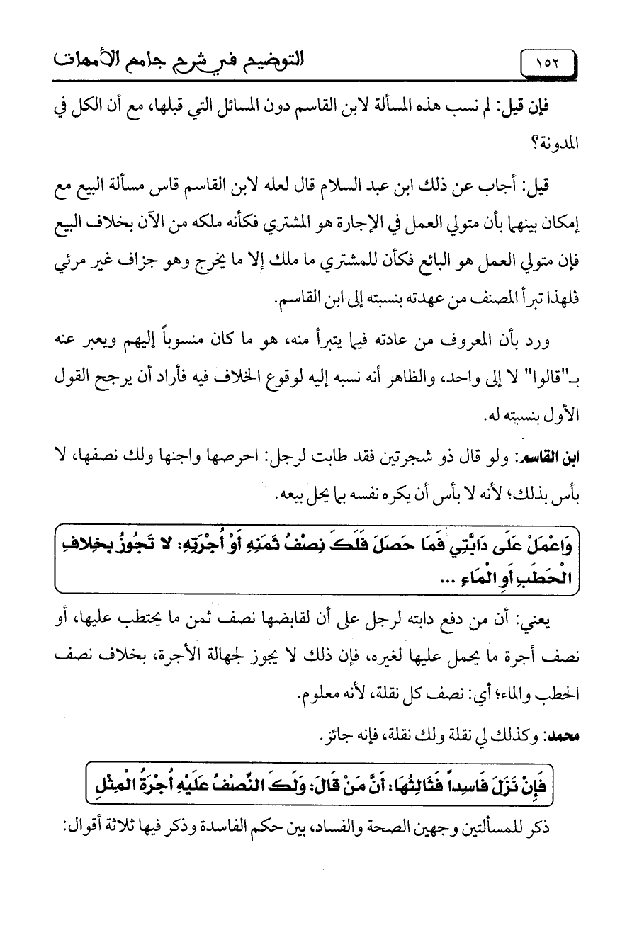 وَاعْمَلْ عَلَى دَابَّتِي فَمَا حَصَلَ فَلَكَ نِصْفُ ثَمَنِهِ أَوْ أُجْرَتِهِ: لا تَجُوزُ بِخِلافِ الْحَطَبِ أَوِ الْمَاءِ ..