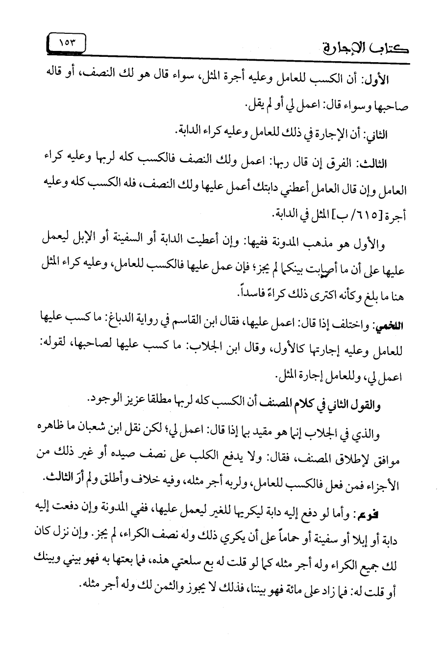 الثالث: الفرق إن قال ربها: اعمل ولك النصف فالكسب كله لربها وعليه كراء العامل وإن قال العالم أعطني دابتك أعمل عليها ولك النصف، فله الكسب كله وعليه أجرة [615/ ب] المثل في الدابة.