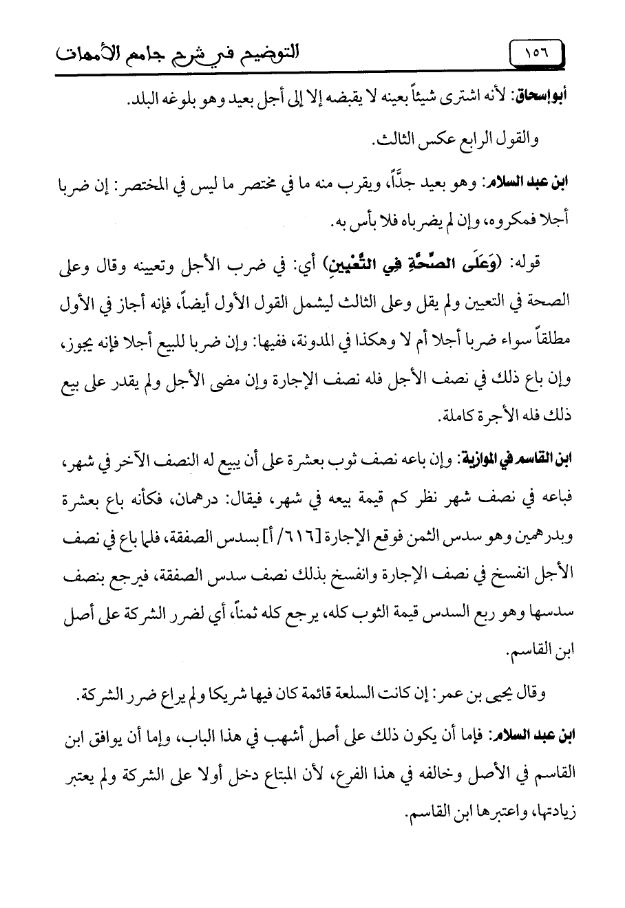ابن عبد السلام: فإما أن يكون ذلك على أصل أشهب في هذا الباب، وإما أن يوافق ابن القاسم في الأصل وخالفه في هذا الفرع، لأن المبتاع دخل أولا على الشركة ولم يعتبر زيادتها، واعتبرها ابن القاسم.