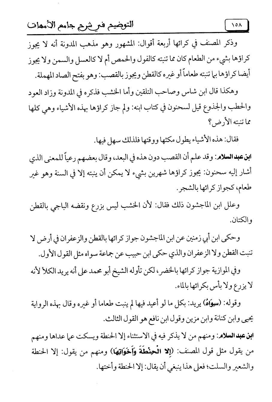 ابن عبد السلام: ومنهم من لا يذكر فيه في الاستثناء إلا الحنطة ويسكت عما عداها ومنهم من يقول مثل قول المصنف: (إِلا الْحِنْطَةَ وَأَخَوَاتِهَا) ومنهم من يقول: إلا الحنطة والشعير والسلت؛ فعلى هذا ينبغي أن يقال: إلا الحنطة وأختها.