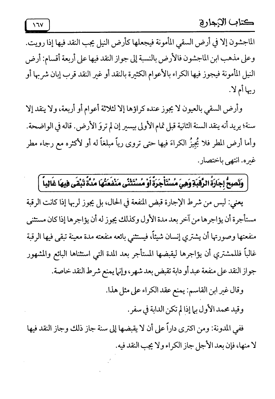 وأرض السقي بالعيون لا يجوز عنده كراؤها إلا لثلاثة أعوام أو أربعة، ولا ينقد إلا سنة؛ يريد أنهي نقد السنة الثانية قبل تمام الأولى بيسير إن لم ترو الأرض. قاله في الواضحة. وأما أرض المطر فلا يجيز الكراء فيها حتى تروى رياً مبلغاً له أو لأكثره مع رجاء مطر غيره. انتهى باختصار.