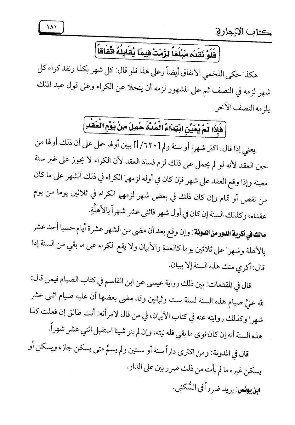 يعني إذا قال: اكتر شهراً أو سنة ولم [620/ أ] يبين أولها حمل على أن ذلك أولها من حين العقد لأنه لو لم يحمل على ذلك لزم فساد العقد لأن الكراء لا يجوز على غير سنة معينة وإذا وقع العقد على شهر فإن كان في أوله لزمهما الكراء في ذلك الشهر على ما كان من نقص أو تمام وإن كان ذلك في بعض شهر لزمهما الكراء في ثلاثين يوماً من يوم عقداه، وكذلك السنة إن كان في أول شهر فاثنى عشر شهراً بالأهلة.