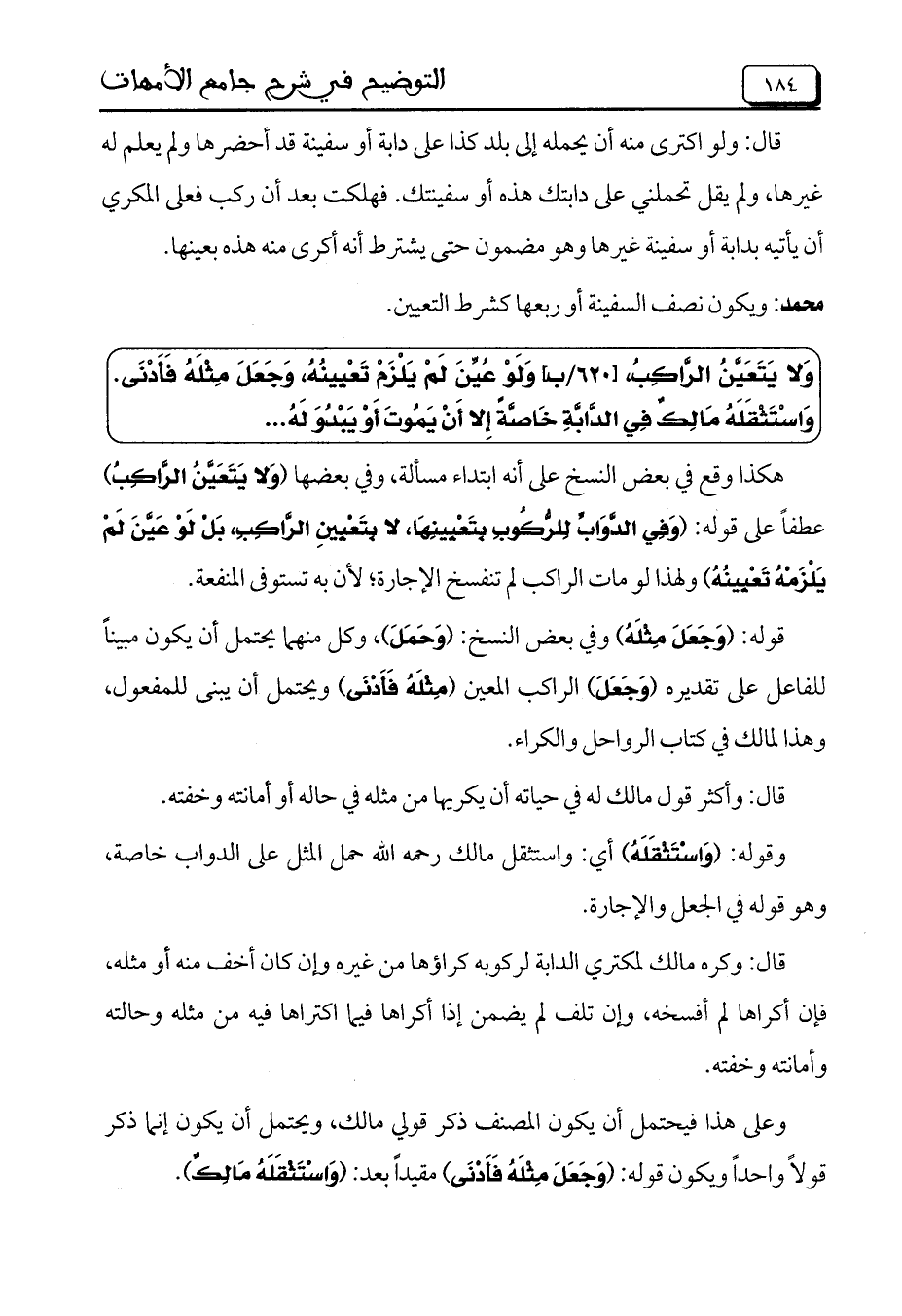 وَلا يَتَعَيَّنُ الرَّاكِبُ، [620/ ب] وَلَوْ عُيِّنَ لَمْ يَلْزَمْ تَعْيينُهُ، وَجَعَلَ مِثْلَهُ فَأَدْنَى. وَاسْتَثْقَلَهُ مَالِكُ فِي الدَّابَّةِ خَاصَّةً إِلا أَنْ يَمُوتَ أَوْ يَبْدُوَ لَهُ ..