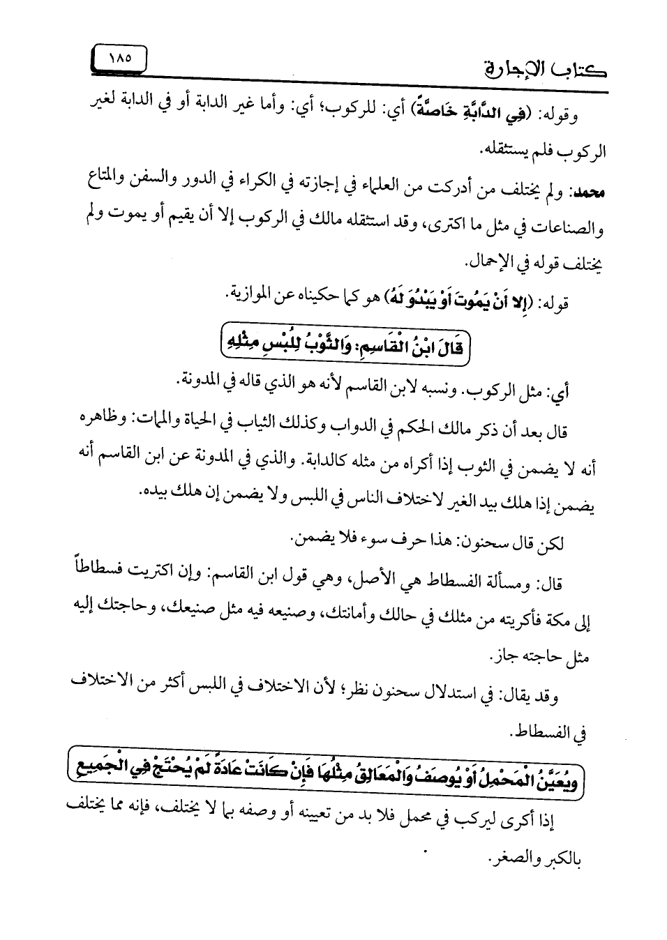 قال بعد أن ذكر مالك الحكم في الدواب وكذلك الثياب في الحياة والممات: وظاهره أنه لا يضمن في الثوب إذا أكراه من مثله كالدابة. والذي في المدونة عن ابن القاسم أنه يضمن إذا هلك بيد الغير لاختلاف الناس في اللبس ولا يضمن إن هلك بيده.