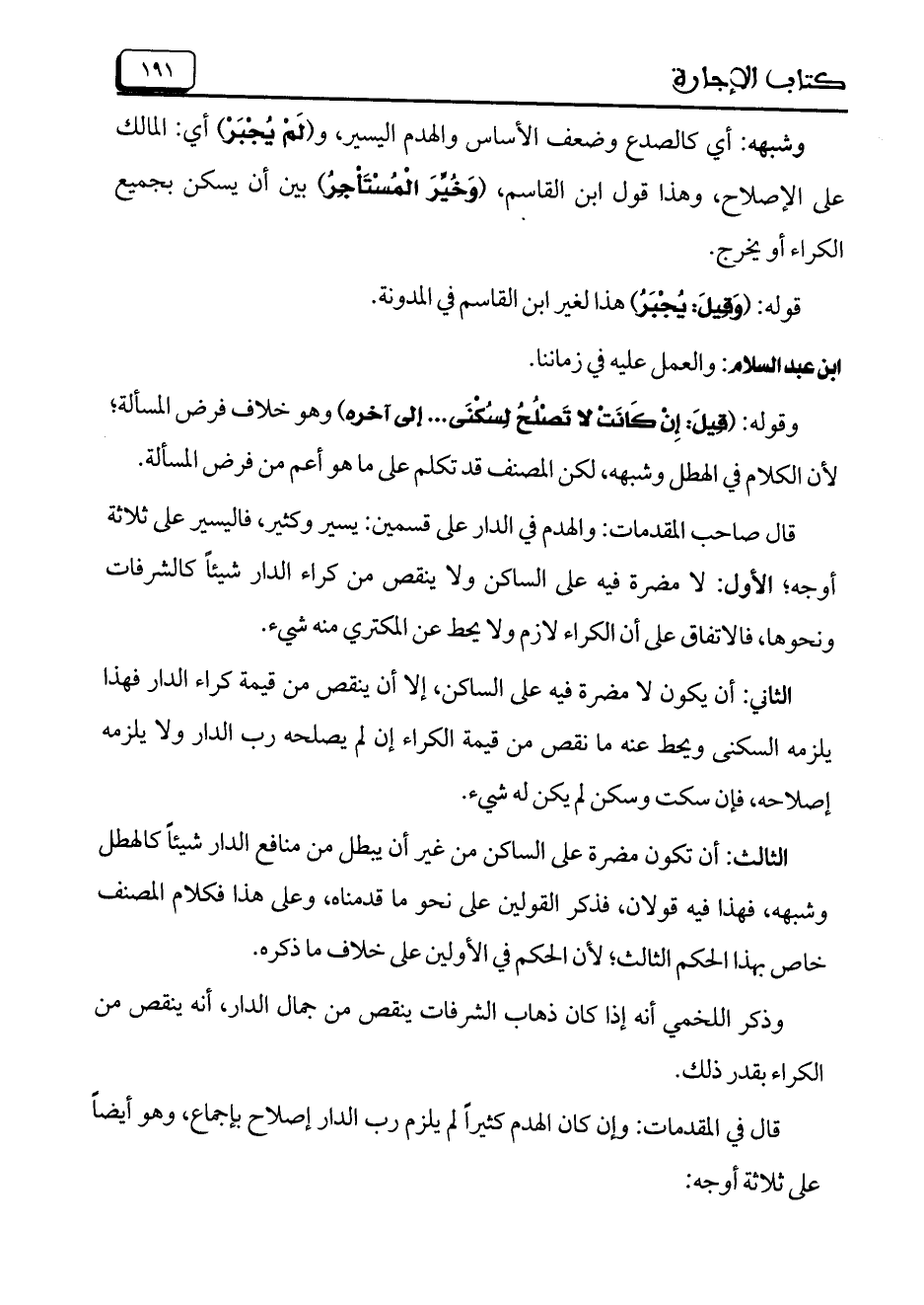 قال صاحب المقدمات: والهدم في الدار على قسمين: يسير وكثير، فاليسير على ثلاثة أوجه؛ الأول: لا مضرة فيه على الساكن ولا ينقص من كراء الدار شيئاً كالشرفات ونحوها، فالاتفاق على أن الكراء لازم ولا يحط عن المكتري منه شيء.