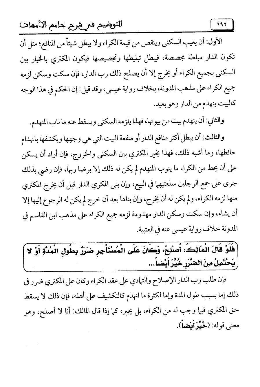 والثالث: أن يبطل أكثر منافع الدار أو منفعة البيت التي هي وجهها ويكشفها بانهدام حائطها، وما أشبه ذلك فهذا يخير المكتري بين السكنى والخروج، فإن أراد أن يسكن على أن يحط من الكراء ما ينوب المنهدم لم يكن له ذلك إلا برضا ربها، فإن رضي بذلك جرى على جمع الرجلين سلعتيهما في البيع، وإن بنى المكري الدار قبل أن يخرج المكتري منها لزمه الكراء، ولم يكن له أن يخرج، وإن بناها بعد أن خرج لم يكن له الرجوع إليها إلا أن يشاء، وإن سكت وسكن الدار مهدومة لزمه جميع الكراء على مذهب ابن القاسم في المدونة خلاف رواية عيسى عنه في العتبية.