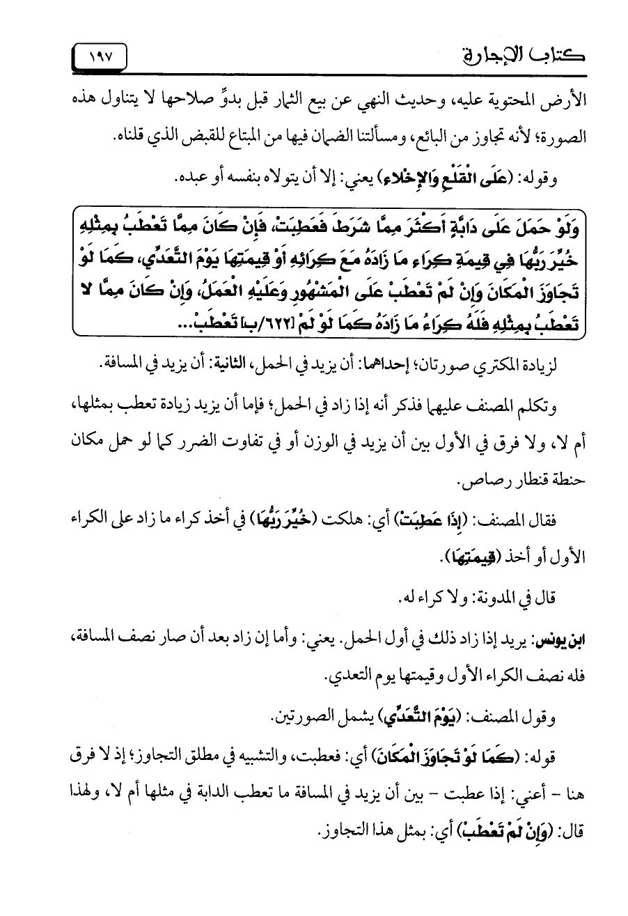 ابن يونس: يريد إذا زاد ذلك في أول الحمل. يعني: وأما إن زاد بعد أن صار نصف المسافة، فله نصف الكراء الأول وقيمتها يوم التعدي.