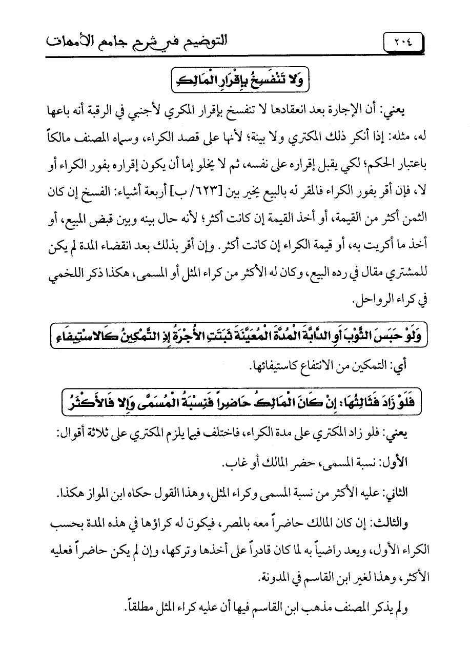 يعني: أن الإجارة بعد انعقادها لا تنفسخ بإقرار المكري لأجنبي في الرقبة أنه باعها له، مثله: إذا أنكر ذلك المكتري ولا بينة؛ لأنها على قصد الكراء، وسماه المصنف مالكاً باعتبار الحكم؛ لكي يقبل إقراره على نفسه، ثم لا يخلو إما أن يكون إقراره بفور الكراء أو لا، فإن أقر بفور الكراء فالمقر له بالبيع يخير بين [623/ب] أربعة أشياء: الفسخ إن كان الثمن أكثر من القيمة، أو أخذ القيمة إن كانت أكثر؛ لأنه حال بينه وبين قبض المبيع، أو أخذ ما أكريت به، أو قيمة الكراء إن كانت أكثر. وإن أقر بذلك بعد انقضاء المدة لم يكن للمشتري مقال في رده البيع، وكان له الأكثر من كراء المثل أو المسمى، هكذا ذكر اللخمي في كراء الرواحل.