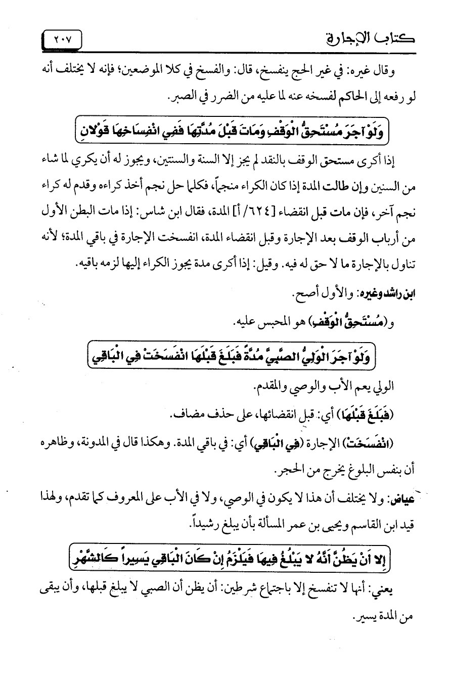 إذا أكرى مستحق الوقف بالنقد لم يجز إلا السنة والسنتين، ويجوز له أن يكري لما شاء من السنين وإن طالت المدة إذا كان الكراء منجماً، فكلما حل نجم أخذ كراءه وقدم له كراء نجم آخر، فإن مات قبل انقضاء [624/أ] المدة، فقال ابن شاس: إذا مات البطن الأول من أرباب الوقف بعد الإجارة وقبل انقضاء المدة، انفسخت الإجارة في باقي المدة؛ لأنه تناول بالإجارة ما لا حق له فيه. وقيل: إذا أكرى مدة يجوز الكراء إليها لزمه باقيه.