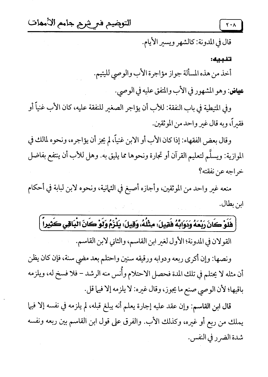 ونصها: وإن أكرى ربعه ودوابه ورقيقه سنين واحتلم بعد مضي سنة، فإن كان يظن أن مثله لا يحتلم في تلك المدة فحصل الاحتلام وأُنس منه الرشد- فلا فسخ له، ويلزمه باقيها؛ لأن الوصي صنع ما يجوز، وقال غيره: لا يلزمه إلا فيما قل.