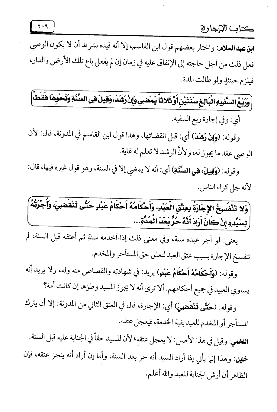 ابن عبد السلام: واختار بعضهم قول ابن القاسم، إلا أنه قيده بشرط أن لا يكون الوصي فعل ذلك من أجل حاجته إلى الإنفاق عليه في زمان إن لم يفعل باع تلك الأرض والدار، فيلزم حينئذٍ ولو طالت المدة.