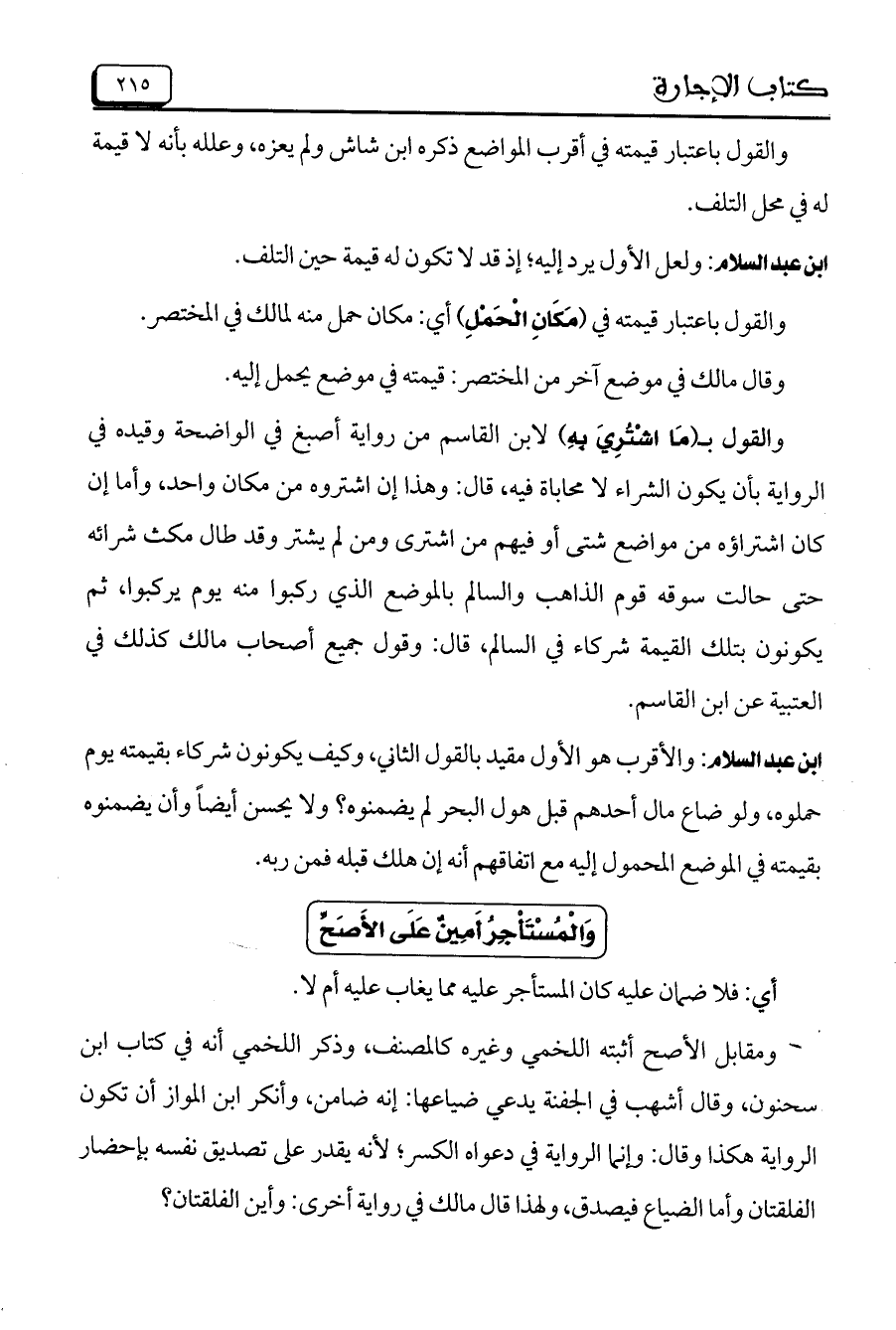 ابن عبد السلام: والأقرب هو الأول مقيد بالقول الثاني، وكيف يكونون شركاء بقيمته يوم حملوه، ولو ضاع مال أحدهم قبل هول البحر لم يضمنوه؟ ولم يحسن أيضاً وأن يضمنون بقيمته في الموضع المحمول إليه مع اتفاقهم أنه إن هلك قبله فمن ربه.