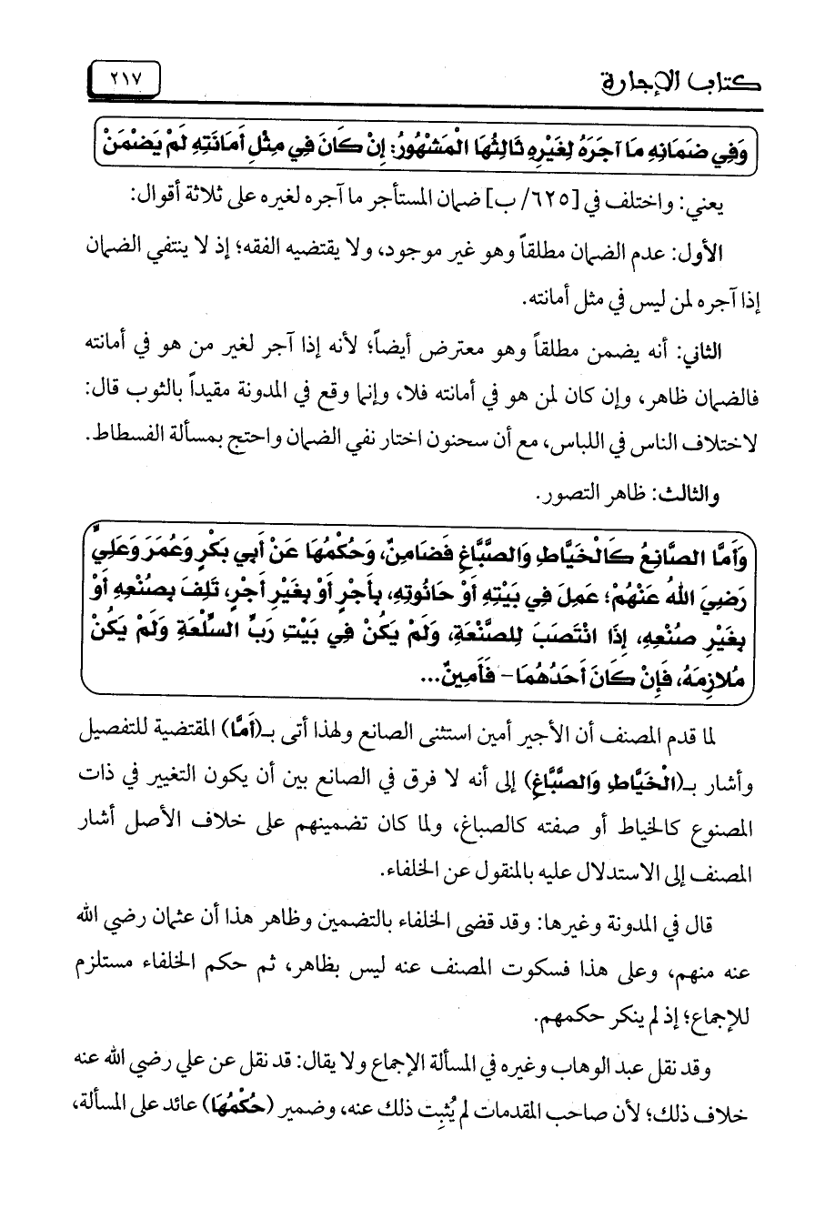 وَأَمَّا الصَّانِعُ كَالْخَيَّاطِ وَالصَّبَّاغِ فَضَامِنٌ، وَحُكْمُهَا عَنْ أَبِي بَكْرٍ وَعُمَرَ وَعَلِيٍّ رَضِيَ اللهُ عَنْهُمْ؛ عَمِلَ فِي بَيْتِهِ أَوْ حَانُوتِهِ، بِأَجْرٍ أَوْ بِغَيْرِ أَجْرٍ، تَلِفَ بِصُنْعِهِ أَوْ بِغَيْرِ صُنْعِهِ، إِذّا انْتَصَبَ لِلصَّنْعَةِ، وَلَمْ يَكُنْ فِي بَيْتِ رَبِّ السِّلْعةِ وَلَمْ يَكُنْ مُلازِمَهُ، فَإِنْ كَانَ أَحَدُهُمَا- فَأَمِينٌ ...