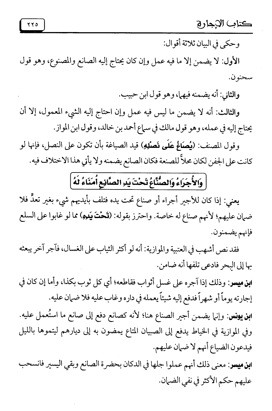 ابن يونس: وإنما يضمن أجير الصناع هنا؛ لأنه كصانع دفع إلى صانع ما استُعمل عليه. وفي الموازية في الخياط يدفع إلى الصبيان المتاع يمضون به إلى ديارهم ليتموها بالليل فيدعون الضياع أنهم لا ضياع عليهم.