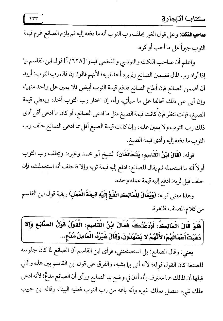 واعلم أن صاحب النكت والتونسي واللخمي قيدوا [628/أ] قول ابن القاسم بما إذا أراد رب المال تضمين الصانع ولم يرد أخذ ثوبه؛ لأنهم قالوا: إن قال رب الثوب: أريد أن أضمن الصانع فإن أطاع الصانع فدفع قيمة الثوب أبيض فلا يمين على واحد منهما، وإن أبى عن ذلك تحالفاً على ما سيأتي، وأما إن اختار رب الثوب أخذه ويعطي قيمة الصبغ، فإنك تنظر فإنْ كانت قيمة الصبغ مثل ما ادعى الصانع، أو كان ما ادعى أقل أدى ذلك رب الثوب ولا يمين عليه، وإن كانت قيمة الصبغ أقل مما ادعى الصانع حلف رب الثوب ما دفعه إليه وأدى قيمة الصبغ.