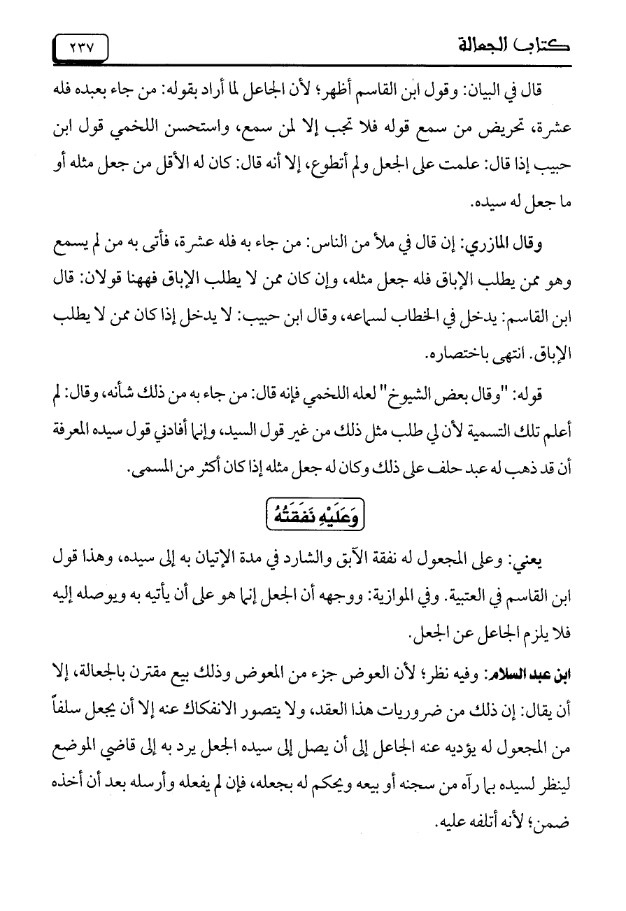 ابن عبد السلام: وفيه نظر؛ لأن العوض جزء من المعوض وذلك بيع مقترن بالجعالة، إلا أن يقال: إن ذلك من ضروريات هذا العقد، ولا يتصور الانفكاك عنه إلا أن يجعل سلفاً من المجعول له يؤديه عنه الجاعل إلى أن يصل إلى سيده الجعل يرد به إلى قاضي الموضع لينظر لسيده بما رآه من سجنه أو بيعه ويحكم له بجعله، فإن لم يفعله وأرسله بعد أن أخذه ضمن؛ لأنه أتلفه عليه.