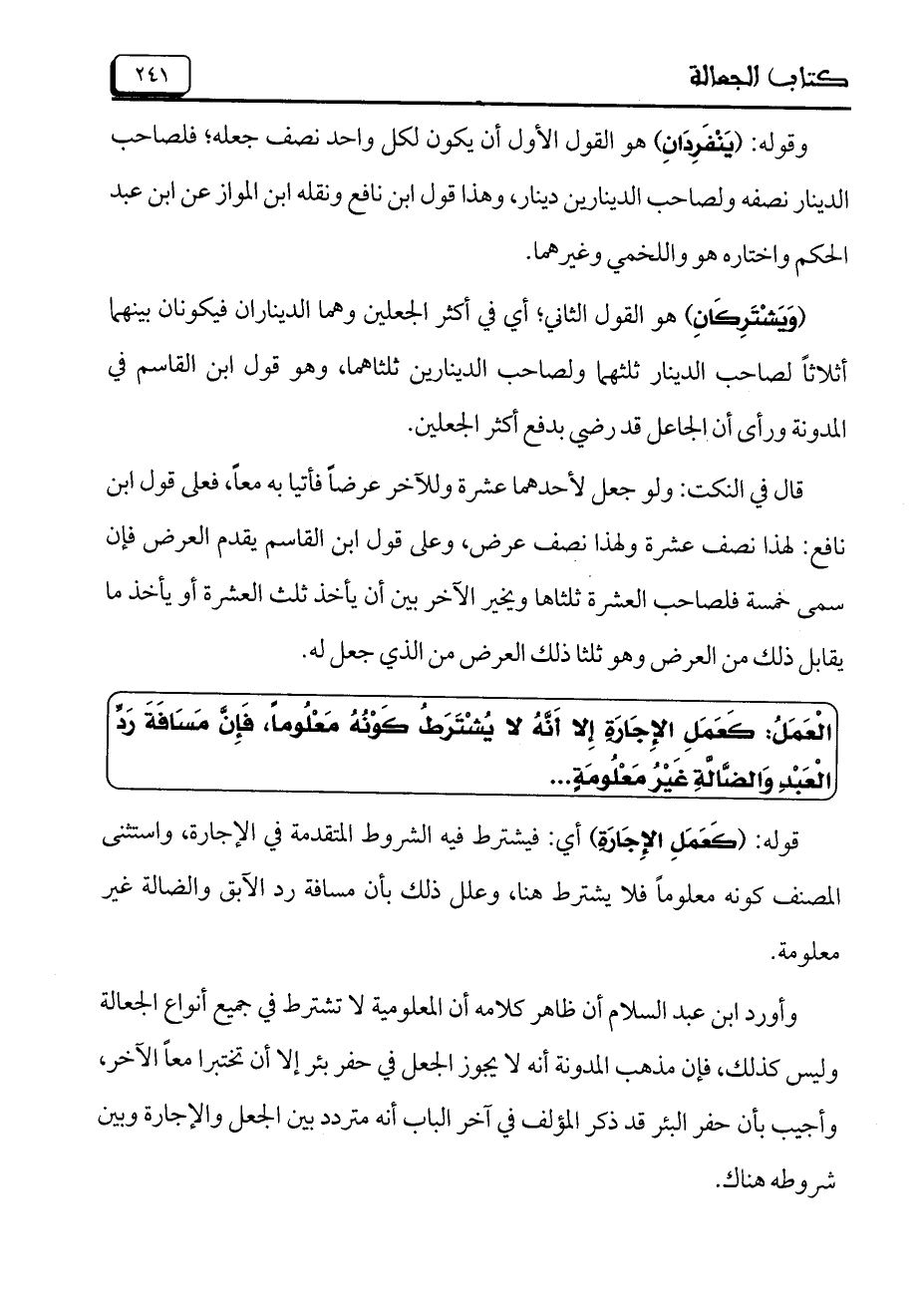 وأورد ابن عبد السلام أن ظاهر كلامه أن المعلومية لا تشترط في جميع أنواع الجعالة وليس كذلك، فإن مذهب المدونة أنه لا يجوز الجعل في حفر بئر إلا أن تختبرا معاً الآخر، وأجيب بأن حفر البئر قد ذكر المؤلف في آخر الباب أنه متردد بين الجعل والإجارة وبين شروطه هناك.