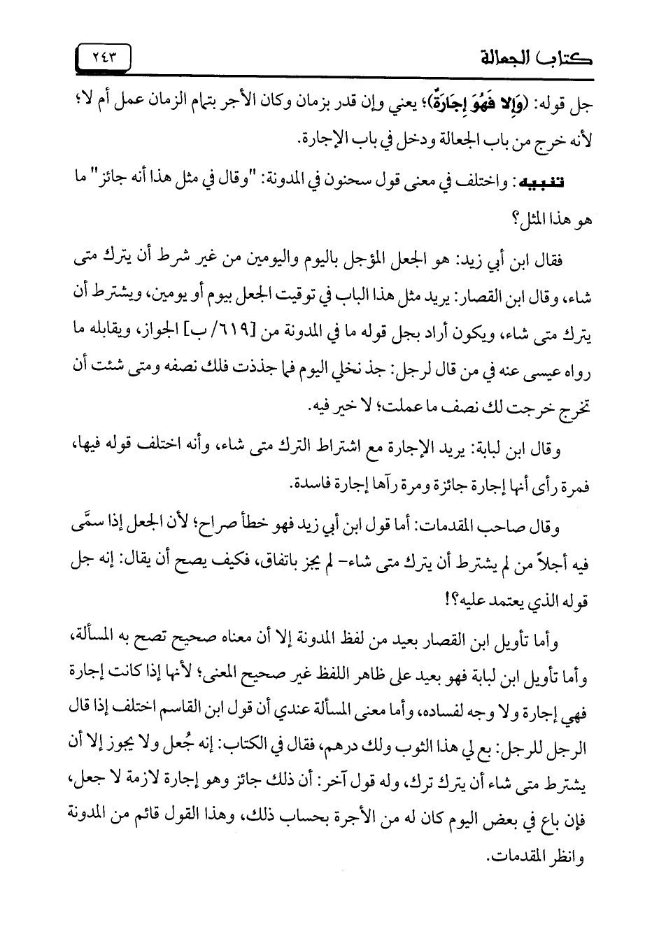 وقال صاحب المقدمات: أما قول ابن أبي زيد فهو خطأ صراح؛ لأن الجعل إذا سمَّى فيه أجلاً من لم يشترط أن يترك متى شاء- لم يجز باتفاق، فكيف يصح أن يقال: إنه جل قوله الذي يعتمد عليه؟!