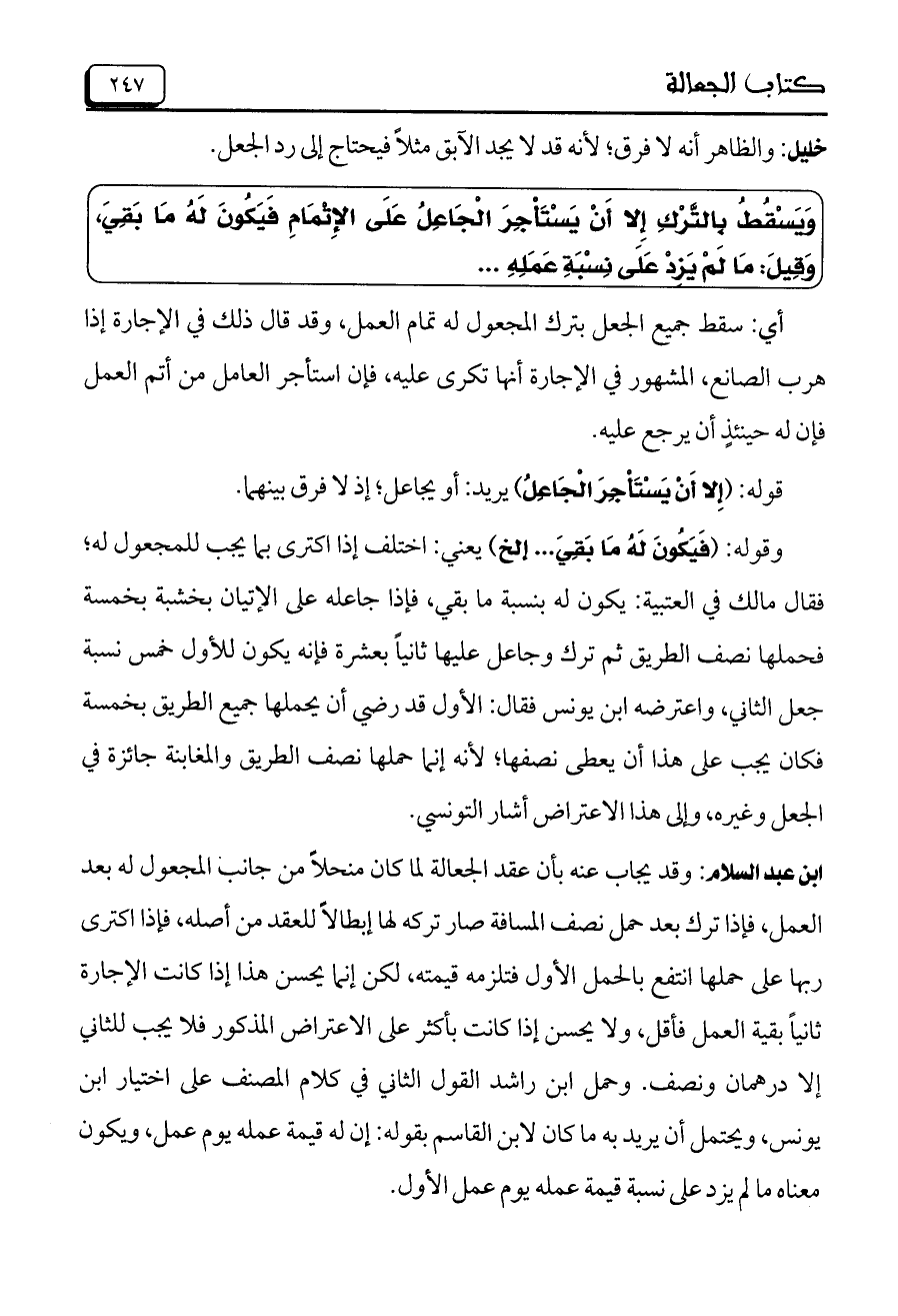 ابن عبد السلام: وقد يجاب عنه بأن عقد الجعالة لما كان منحلاً من جانب المجعول له بعد العمل، فإذا ترك بعد حمل نصف المسافة صار تركه لها إبطالاً للعقد من أصله، فإذا اكترى ربها على حملها انتفع بالحمل الأول فتلزمه قيمته، لكن إنما يحسن هذا إذا كانت الإجارة ثانياً بقية العمل فأقل، ولا يحسن إذا كانت بأكثر على الاعتراض المذكور فلا يجب للثاني إلا درهمان ونصف. وحمل ابن راشد القول الثاني في كلام المصنف على اختيار ابن يونس، ويحتمل أن يريد به ما كان لابن القاسم بقوله: إن له قيمة عمله يوم عمل، ويكون معناه ما لم يزد على نسبة قيمة عمله يوم عمل الأول.