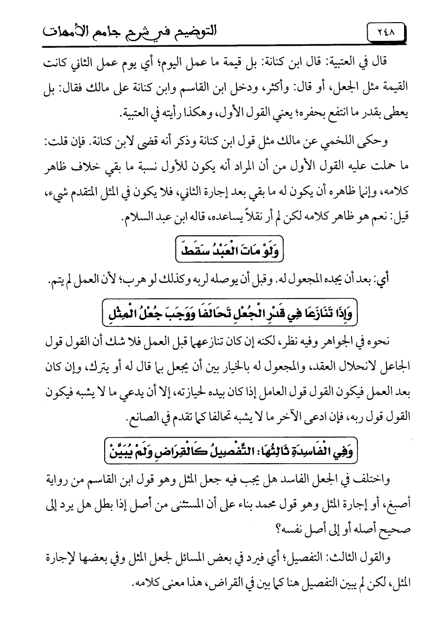 واختلف في الجعل الفاسد هل يجب فيه جعل المثل وهو قول ابن القاسم من رواية أصبغ، أو إجارة المثل وهو قول محمد بناءً على أن المستثنى من أصل إذا بطل هل يرد إلى صحيح أصله أو إلى أصل نفسه؟