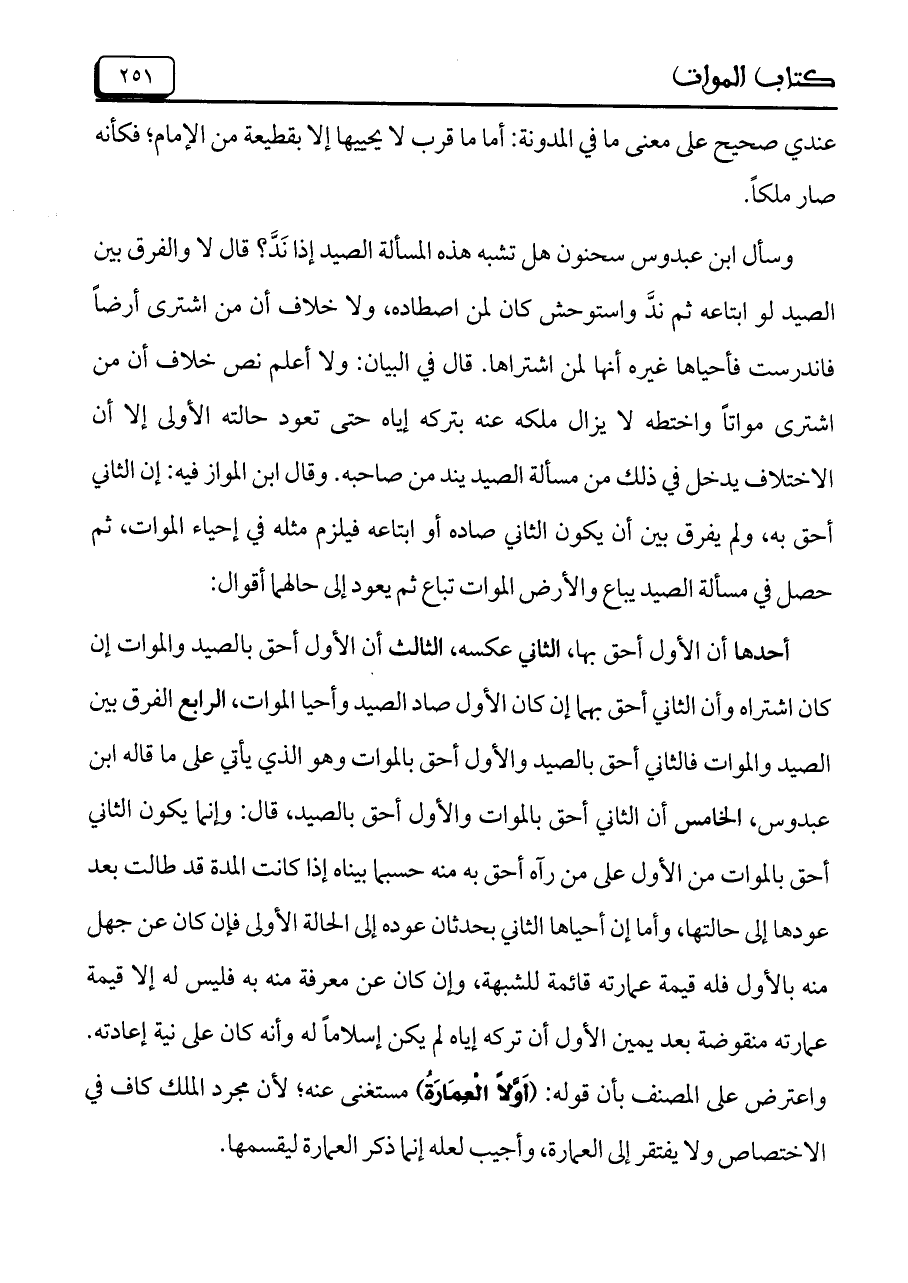 أحدها أن الأول أحق بها، الثاني عكسه، الثالث أن الأول أحق بالصيد والموات إن كان اشتراه وأن الثاني أحق بهما إن كان الأول صاد الصيد وأحيا الموات، الرابع الفرق بين الصيد والموات فالثاني أحق بالصيد والأول أحق بالموات وهو الذي يأتي على ما قاله ابن عبدوس، الخامس أن الثاني أحق بالموات والأول أحق بالصيد، قال: وإنما يكون الثاني أحق بالموات من الأول على من رآه أحق به منه حسبما بيناه إذا كانت المدة قد طالت بعد عودها إلى حالتها، وأما إن أحياها الثاني بحدثان عوده إلى الحالة الأولى فإن كان عن جهل منه بالأول فله قيمة عمارته قائمة للشبهة، وإن كان عن معرفة منه به فليس له إلا قيمة عمارته منقوضة بعد يمين الأول أن تركه إياه لم يكن إسلاماً له وأنه كان على نية إعادته. واعترض على المصنف بأن قوله: (أَوَّلاً الْعِمَارَةُ) مستغنى عنه؛ لأن مجرد الملك كاف في الاختصاص ولا يفتقر إلى العمارة، وأجيب لعله إنما ذكر العمارة ليقسمها.