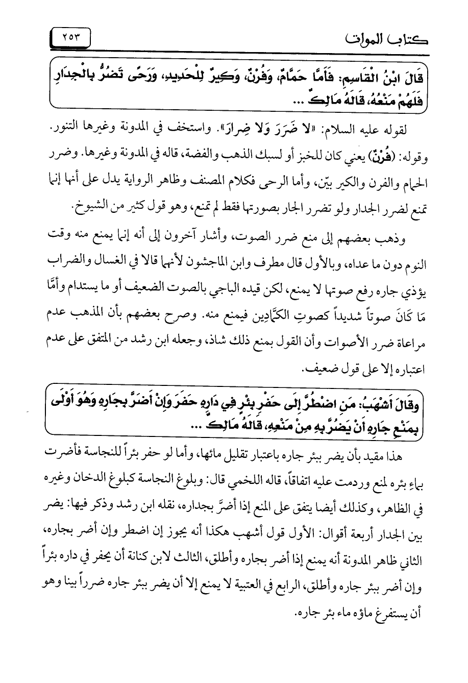 وَقَالَ أَشْهَبُ: مَنِ اضْطُرَّ إِلَى حَفْرِ بِئْرٍ فِي دَارِهِ حَفَرَ وَإِنْ أَضَرَّ بِجَارِهِ وَهُوَ أَوْلَى بِمَنْعِ جَارِهِ أَنْ يَضُرَّ بِهِ مِنْ مَنْعِهِ، قَالَهُ مَالِكٌ ...