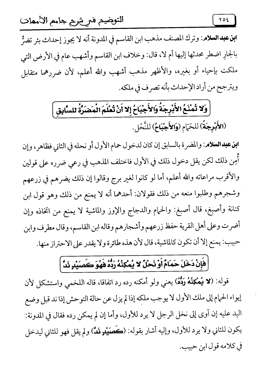 ابن عبد السلام: وترك المصنف مذهب ابن القاسم في المدونة أنه لا يجوز إحداث بئر تضرُّ بالجارِ اضطر محدثها إليها أم لا، قال: وخلاف ابن القاسم وأشهب عام في الأرض التي ملكت بإحياء أو بغيره، والأظهر مذهب أشهب والله أعلم، لأن ضررهما متقابل ويترجح من أراد الإحداث بأنه تصرف في ملكه.