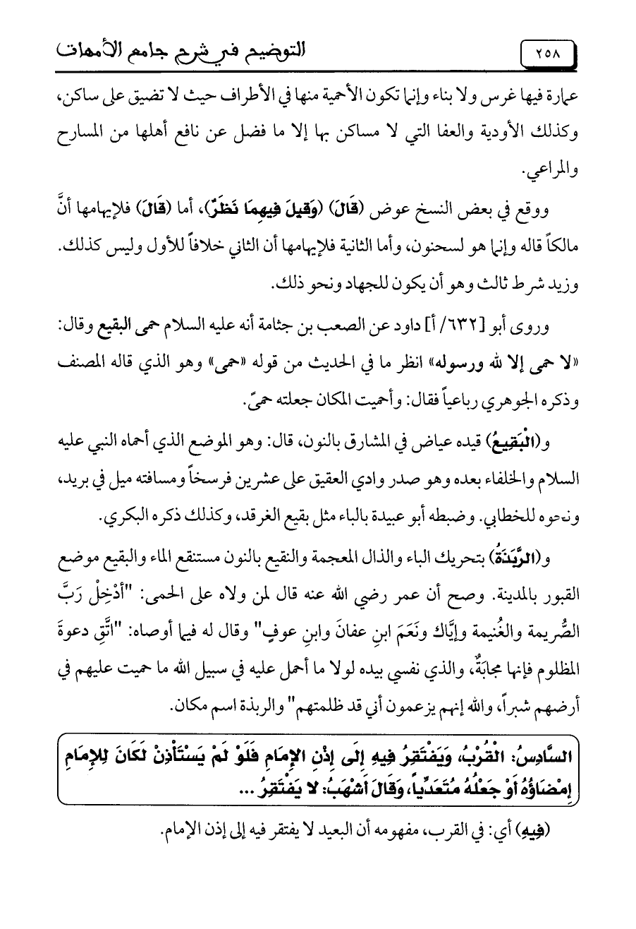 و (الرَّبَذَةَ) بتحريك الباء والذال المعجمة والنقيع بالنون مستنقع الماء والبقيع موضع القبول بالمدينة. وصح أن عمر رضي الله عنه قال لمن ولاه على الحمى: "أدْخِلْ رَبَّ الصُّريمة والغُنيمة وإيَّاك ونَعَمَ ابنِ عفانَ وابنِ عوفٍ" وقال له فيما أوصاه: "اتَّقِ دعوةَ المظلوم فإنها مجابَةٌ، والذي نفسي بيده لولا ما أحمل عليه في سبيل الله ما حميت عليهم في أرضهم شبراً، والله إنهم يزعمون أني قد ظلمتهم" والربذة اسم مكان.