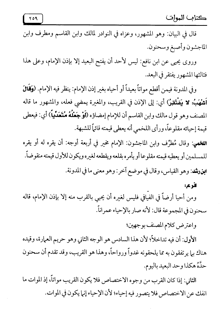 ومن أحيا أرضاً في الفيافي فليس لغيره أن يحيي بالقرب منه إلا بإذن الإمام، قاله سحنون في المجموعة قال: لأنه صار بالإحياء عمراناً.
