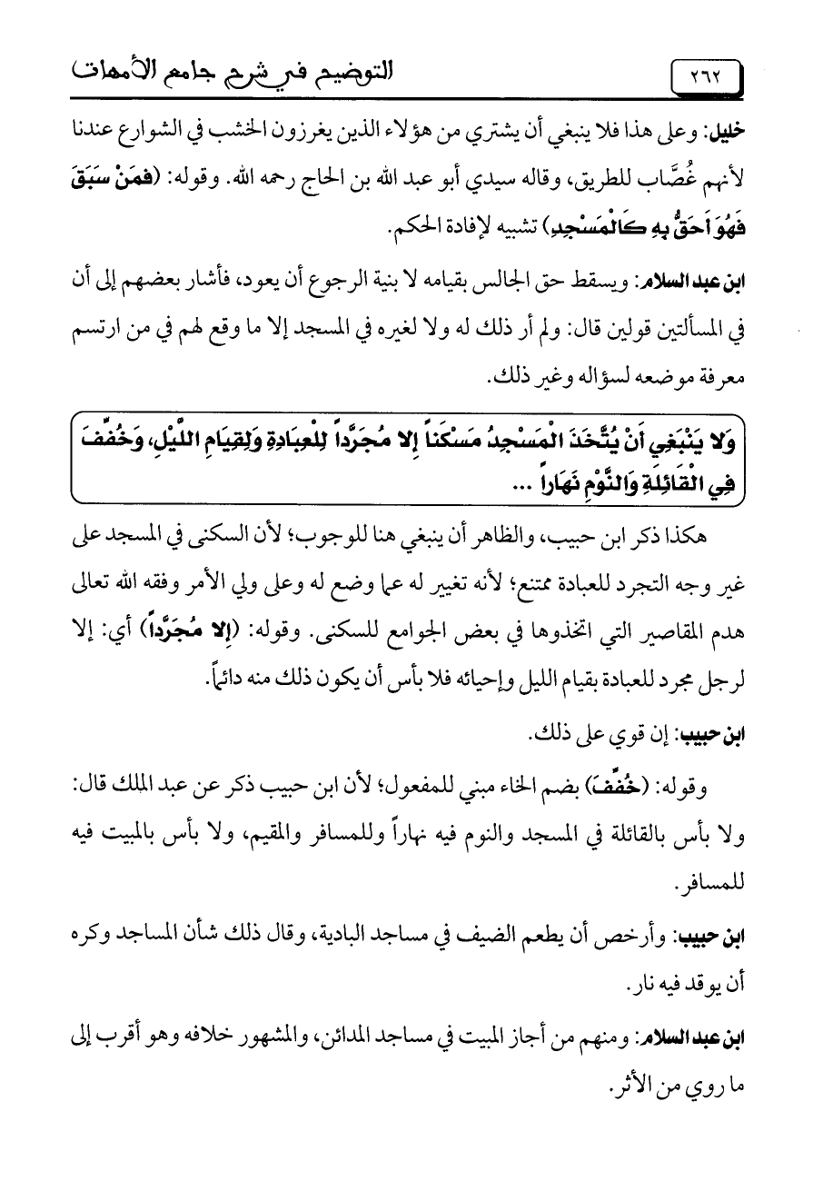 وَلا يَنْبَغِي أَنْ يُتَّخَذَ الْمَسْجِدُ مَسْكَنَاً إِلا مُجَرَّداً لِلْعِبَادَةِ وَلِقِياِم اللَّيْلِ، وَخُفِّفَ فِي الْقَائِلَةِ وَالنَّوْمِ نَهَاراً ...