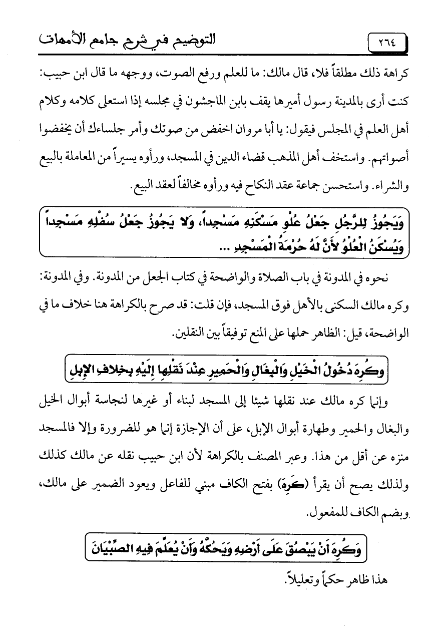 كراهة ذلك مطلقاً فلا، قال مالك: ما للعلم ورفع الصوت، ووجهه ما قال ابن حبيب: كنت أرى بالمدينة رسول أميرها يقف بابن الماجشون في مجلسه إذا استعلى كلامه وكلام أهل العلم في المجلس فيقول: يا أبا مروان اخفض من صوتك وأمر جلساءك أن يخفضوا أصواتهم. واستخف أهل المذهب قضاء الدين في المسجد أن يخفضوا أصواتهم. واستخف أهل المذهب قضاء الدين في المسجد، ورأوه يسيراً من المعاملة بالبيع والشراء. واستحسن جماعة عقد النكاح فيه ورأوه مخالفاً لعقد البيع.