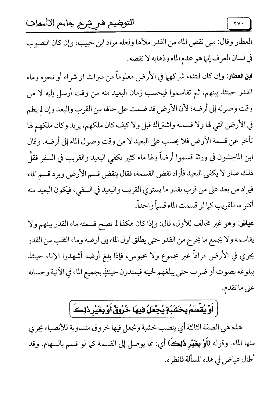 ابن العطار: وإن كان ابتداء شركهما في الأرض معلوماً من ميراث أو شراء أو نحوه وماء القدر حينئذ بينهم، ثم تقاسموا فيحسب زمان البعيد منه من وقت أرسل إليه لا من وقت وصوله إلى أرضه؛ لأن الأرض قد ضمت على حالها من القرب والبعد وإن لم يطم في الأرض التي لها ولا قسمته واشتراك قبل ولا كيف كان ملكهم، يريد وكان ملكهم لها تأخر عن قسمة الأرض فلا يحسب على البعيد لا من وقت وصول الماء إلى أرضه. وقال ابن الماجشون في ورثة قسموا أرضاً ولها ماء كثير يكفي البعيد والقريب في السفر فقلَّ ذلك صار لا يكفي البعيد فأراد نقض القسمة، فقال ينقض قسم الأرض ويرد قسم الماء فيزاد من بعد على من قرب بقدر ما يستوي القريب والبعيد في السقي، فيكون البعيد منه أكثر ما للقريب كما لو قسمت الماء قسماً واحداً.