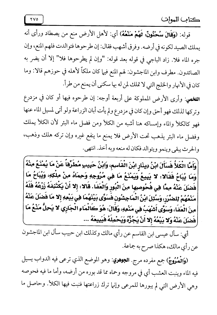 وَأَمَّا الْكَلأُ فَسَأَلَ ابْنُ دِينَارٍ ابْنَ الْقَاسِمِ، وَابْنُ حَبِيبٍ مُطَرِّفاً عَنْ مَا يُمْنَعُ مِنْهُ وَمَا يُبَاحُ فَقَالا: لا يَبِيعُ وَيَمْنَعُ مَا فِي مُرُوجِهِ وَحِمَاهُ مِنْ مِلْكِهِ، وَيُبَاحُ مَا فَضَلَ عَنْهُ مِمَّا فِي فُحُوصِها مِنَ الْبُورِ وَالْعَفَا. قَالا: إِلا أَنْ يَكْتَنِفَهُ زَرْعُهُ فَلَهُ مَنْعُهُمْ لِلضَّرَر، وَسُئِلَ ابْنُ الْمَاجِشُونِ فَسَوَّى بَيْنَهُمَا فِي بَيْعِهِ إِلا مَا فَضَلَ عَنْهُ مِنْ الْعَفَا، وَسَوَّى أَشْهَبُ فِي مَنْعِهِ، وَقَالَ: هُوَ كَالْمَاءِ الْجَارِي لا يَحِلُّ مَنْعُ مَا فَضَلَ عَنْهُ وَلا بَيْعُهُ إِلا أَنْ يَجُزَّهُ وَيَحْمِلَهُ فَيَبِيعَهُ ...