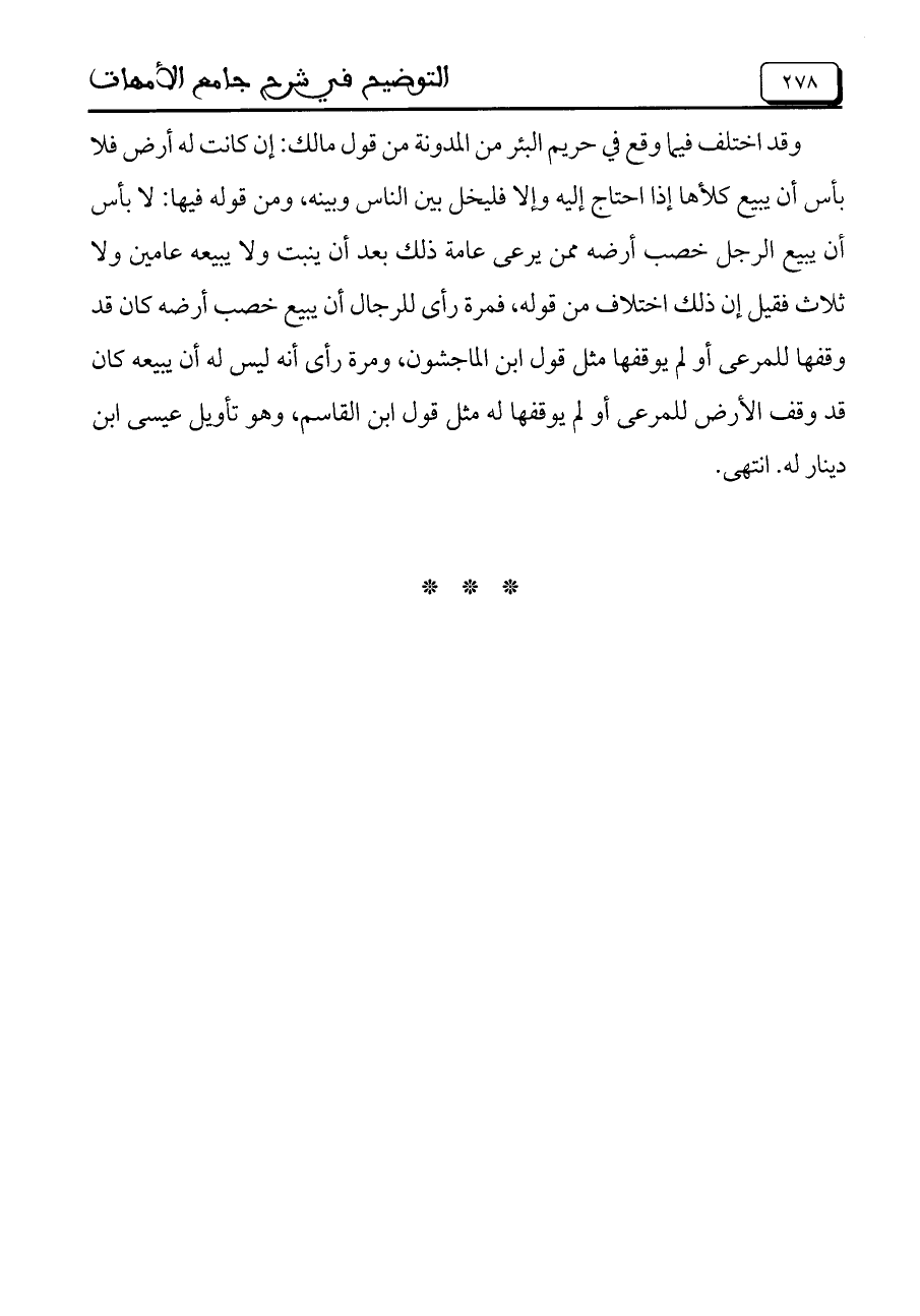 وقد اختلف فيما وقع في حريم البئر من المدونة من قول مالك: إن كانت له أرض فلا بأس أن يبيع كلأها إذا احتاج إليه وإلا فليخل بين الناس وبينه، ومن قوله فيها: لا بأس أن يبيع الرجل خصب أرضه ممن يرعى عامة ذلك بعد أن ينبت ولا يبيعه عامين ولا ثلاث فقيل إن ذلك اختلاف من قوله، فمرة رأى للرجال أن يبيع خصب أرضه كان قد وقفها للمرعى أو لم يوقفها مثل قول ابن الماجشون، ومرة رأى أنه ليس له أن يبيعه كان قد وقف الأرض للمرعى أو لم يوقفها له مثل قول ابن القاسم، وهو تأويل عيسى ابن دينار له. انتهى.