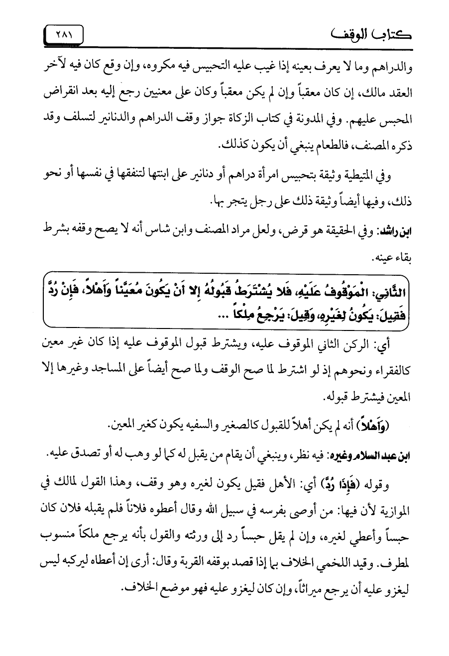 الثَّانِي: الْمَوْقُوفُ عَلَيْهِ، فَلا يُشْتَرَطُ قَبُولُهُ إِلا أَنْ يَكُونَ مُعَيَّناً وَأَهْلاً، فَإِنْ رُدَّ فَقِيلَ: يَكُونُ لِغَيْرِهِ، وَقِيلَ: يَرْجِعُ مِلْكاً ...