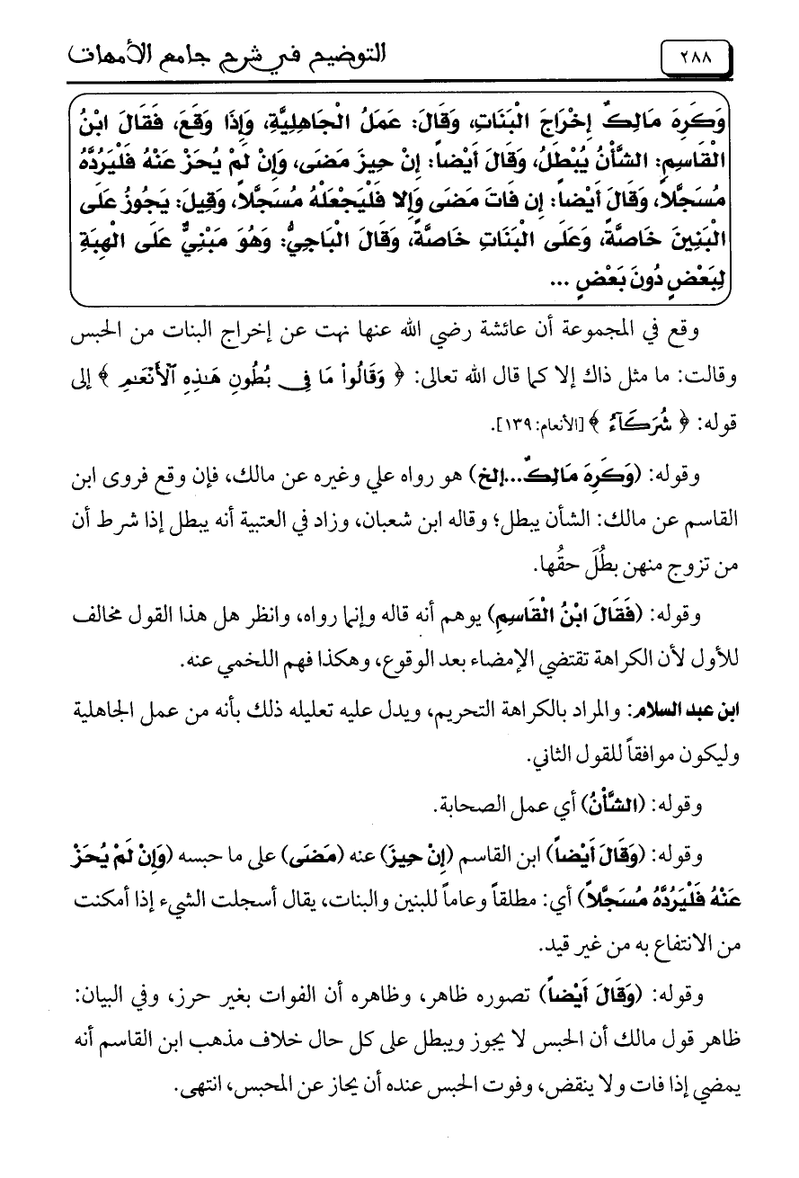 وقع في المجموعة أن عائشة رضي الله عنها نهت عن إخراج البنات من الحبس وقالت: ما مثل ذاك إلا كما قال الله تعالى: {وَقَالُوا مَا فِي بُطُونِ هَذِهِ الأَنْعَامِ} إلى قوله: {شُرَكَاءُ} [الأنعام: 139].