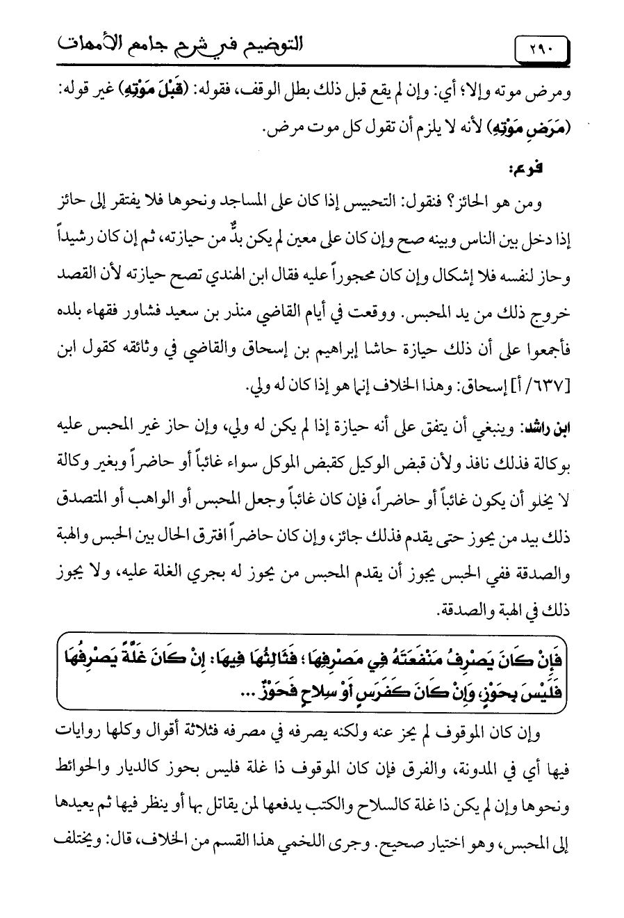 ومن هو الحائز؟ فنقول: التحبيس إذا كان على المساجد ونحوها فلا يفتقر إلى حائز إذا دخل بين الناس وبينه صح وإن كان على معين لم يكن بدٌّ من حيازته، ثم إن كان رشيداً وحاز لنفسه فلا إشكال وإن كان محجوراً عليه فقال ابن الهندي تصح حيازته لأن القصد خروج ذلك من يد المحبس. ووقعت في أيام القاضي منذر بن سعيد فشاور فقهاء بلده فأجمعوا على أن ذلك حيازة حاشا إبراهيم بن إسحاق والقاضي في وثائقه كقول ابن [637/أ] إسحاق: وهذا الخلاف إنما هو إذا كان له ولي.