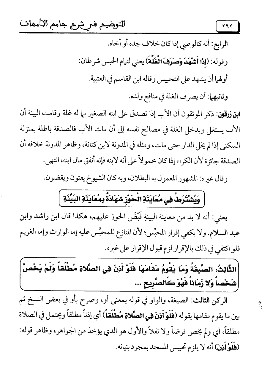 الركن الثالث: الصيغة، والواو في قوله بمعنى أو، وصرح بأو في بعض النسخ ثم بين ما يقوم مقامها بقوله (فَلَوْ أَذِنَ فِي الصَّلاةِ مُطْلَقاً) أي إذناً مطلقاً ويحتمل في الصلاة مطلقاً، أي ولم يخص فرضاً ولا نفلاً والأول هو الذي يؤخذ من الجواهر، وظاهر قوله: (فَلَوْ أَذِنَ) أنه لا يلزم تحبيس المسجد بمجرد بنيانه.